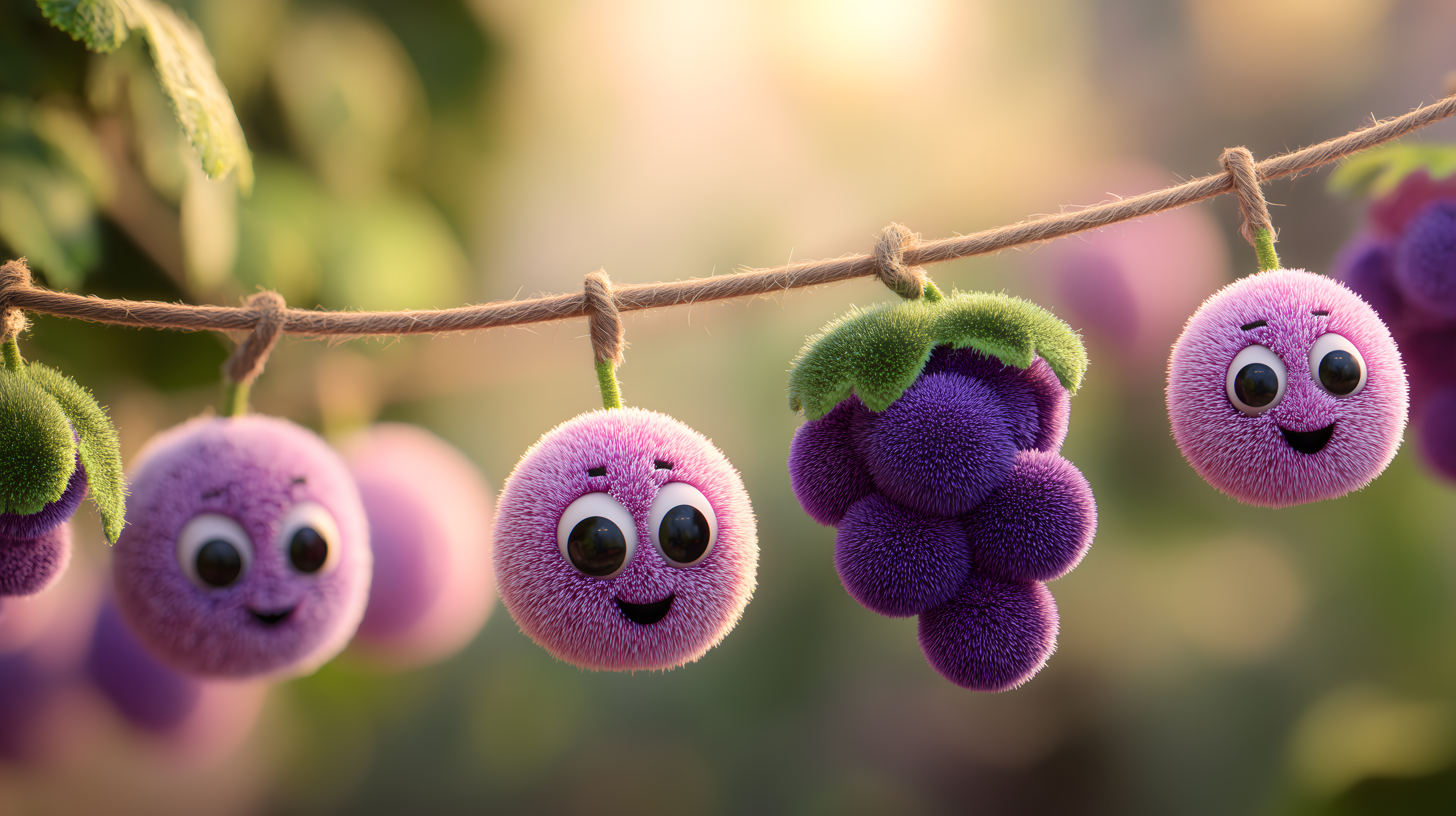 Das Bild zeigt ein fröhliches Muster aus lila, flauschigen Traubenformen mit niedlichen Gesichtern, die an einem Seil hängen. Die Farben sind kräftig und lebendig, während der Hintergrund leicht verschwommen erscheint, um den Fokus auf die verspielten Beeren zu lenken. Diese einzigartige grafische Darstellung könnte in Blogbeiträgen, Newsletter-Designs, Social-Media-Posts oder Werbematerialien eingesetzt werden, um eine fröhliche, fantasievolle Atmosphäre zu schaffen. Dieses hochwertige Stockfoto in hoher Auflösung steht unter einer Creative-Commons-Lizenz kostenlos zur Verfügung.