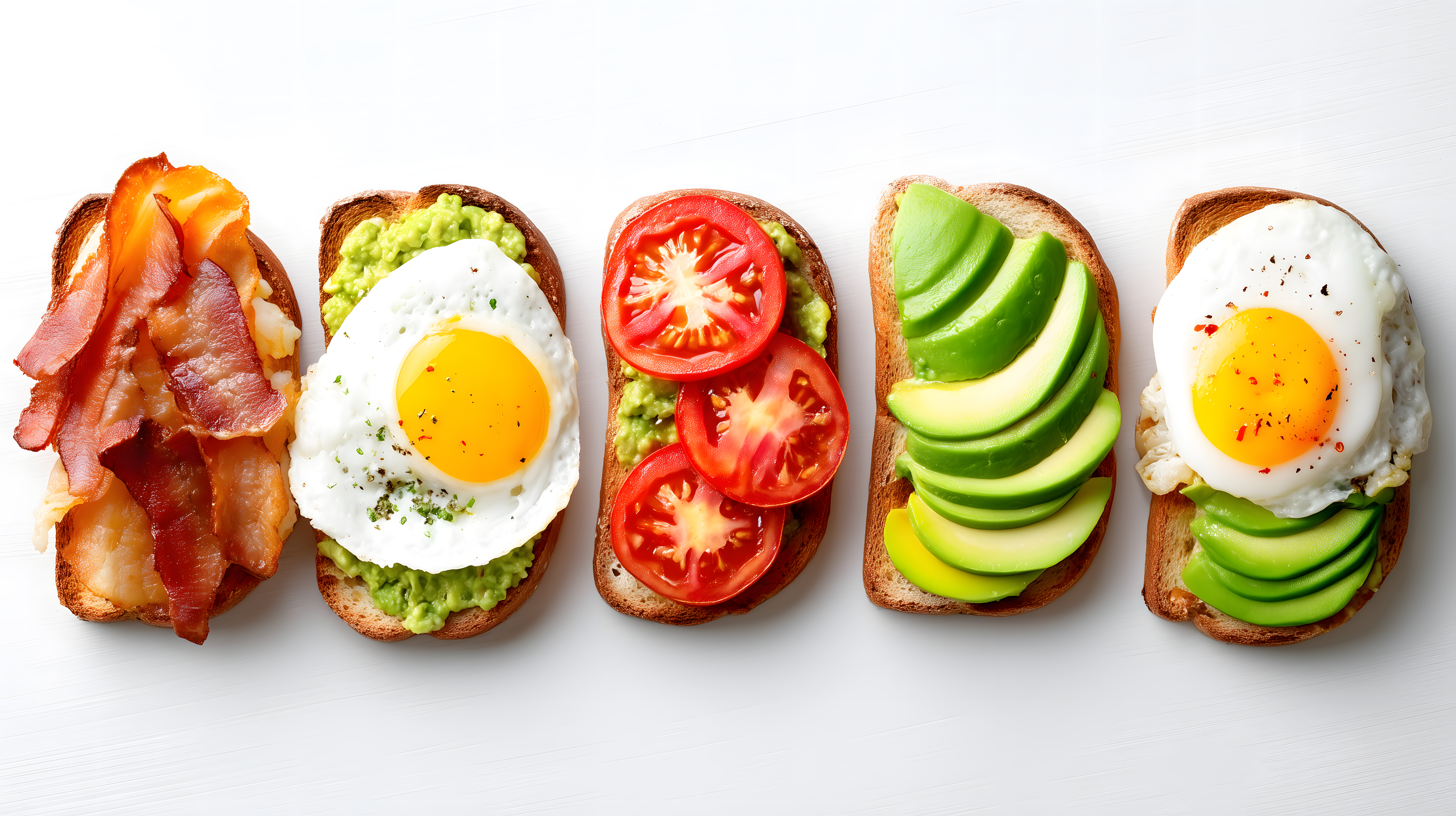 Dieses vielseitige Foto zeigt eine Reihe von Toast-Variationen mit unterschiedlichen, frischen Zutaten. Im Mittelpunkt stehen knuspriger Toastbrot, cremiges Avocadomus, saftige Tomaten, köstliches Speck und goldgelbe Spiegeleier. Die Kombination der Zutaten in einer aufgeräumten, minimalistischen Anordnung vor weißem Hintergrund schafft ein appetitliches und harmonisches Gesamtbild. Das Foto eignet sich hervorragend für Verwendungen in Blogs, Rezeptsammlungen, Werbematerialien oder Social-Media-Beiträgen rund um das Thema gesunde, abwechslungsreiche Ernährung. Als hochwertiges, kostenloses Stockfoto unter Creative-Commons-Lizenz kann es frei genutzt werden.
