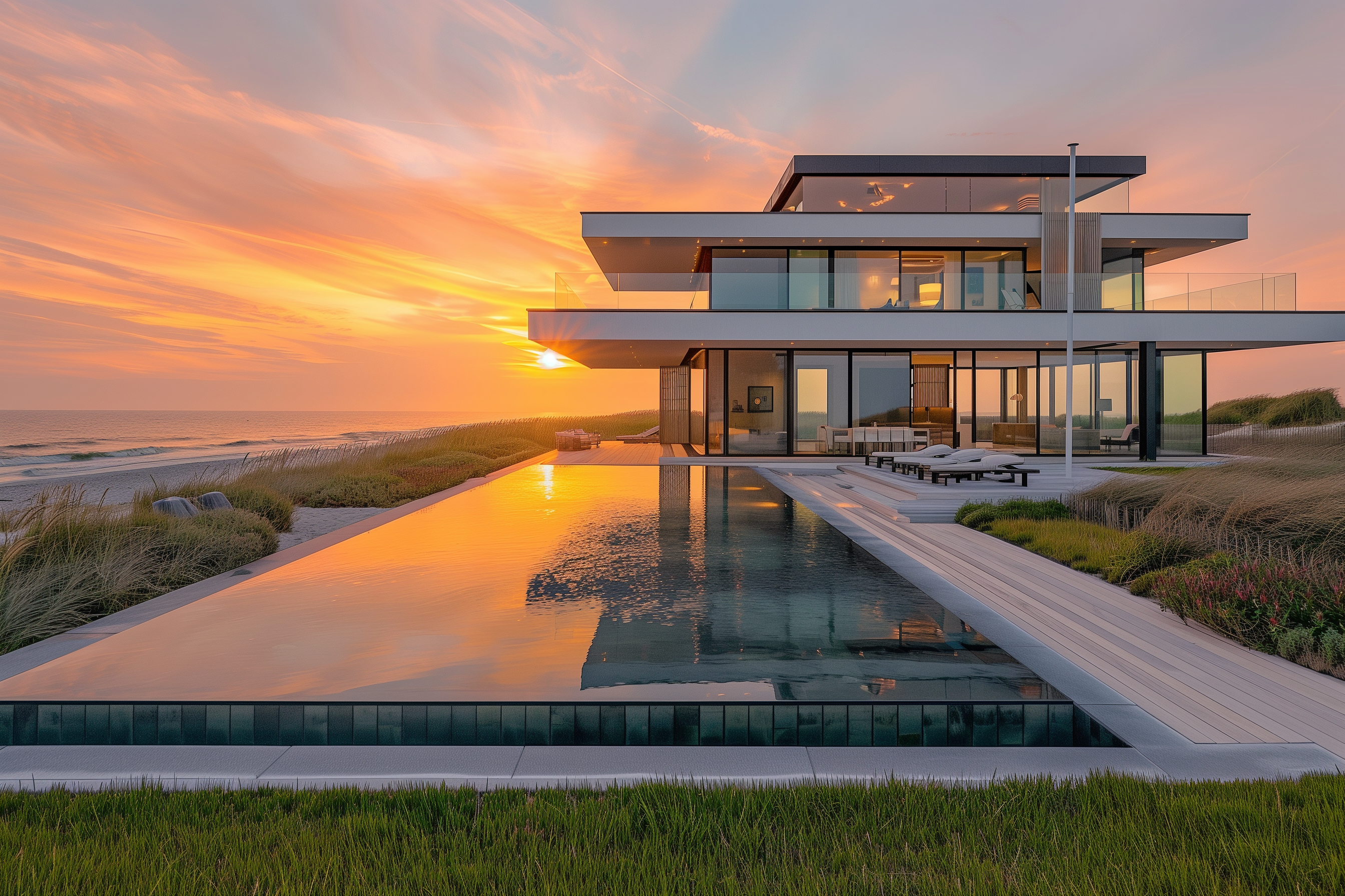 Das Bild zeigt ein beeindruckendes Strandehaus mit Blick auf den Ozean. Die moderne Architektur aus Glas und Holz ist perfekt in die natürliche Umgebung integriert. Der wunderschöne Sonnenuntergang taucht das Haus und den Pool in ein warmes, orangefarbenes Licht und spiegelt sich auf der Wasseroberfläche. Die Terrasse lädt zum Entspannen ein und bietet einen atemberaubenden Ausblick. Dieses Foto eignet sich hervorragend für den Einsatz in Blogs, Newslettern, Social-Media-Beiträgen oder Werbekampagnen. Als kostenloses Stockfoto in hoher Auflösung ist es unter einer Creative-Commons-Lizenz frei nutzbar.