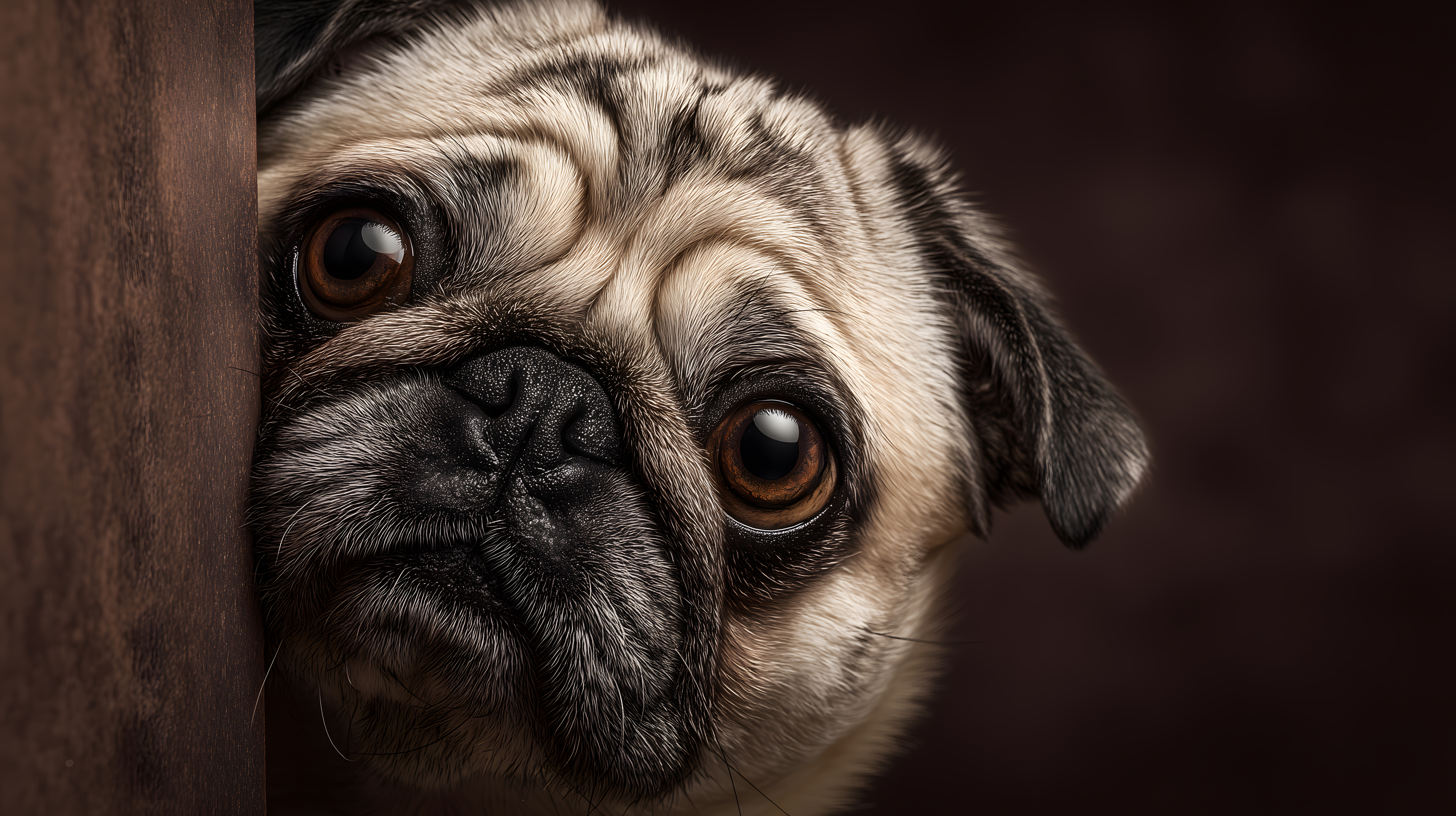 Dieses fesselnde Schwarz-Weiß-Foto zeigt einen Mops, der vorsichtig aus einer dunklen Ecke hervorschaut. Der Hund hat einen konzentrierten, fast neugierigen Blick, als würde er beobachten, was um ihn herum passiert. Die scharfe Nahaufnahme betont die detaillierten Texturen des Gesichts, wie die Falten an der Stirn und die wachen Augen. Dieses Stockfoto eignet sich hervorragend für den Einsatz in Blogbeiträgen, Werbekampagnen oder Social-Media-Kanälen rund um Haustiere, Wohnen und Lifestyle. Es ist in hoher Auflösung und unter einer Creative-Commons-Lizenz kostenfrei verfügbar.