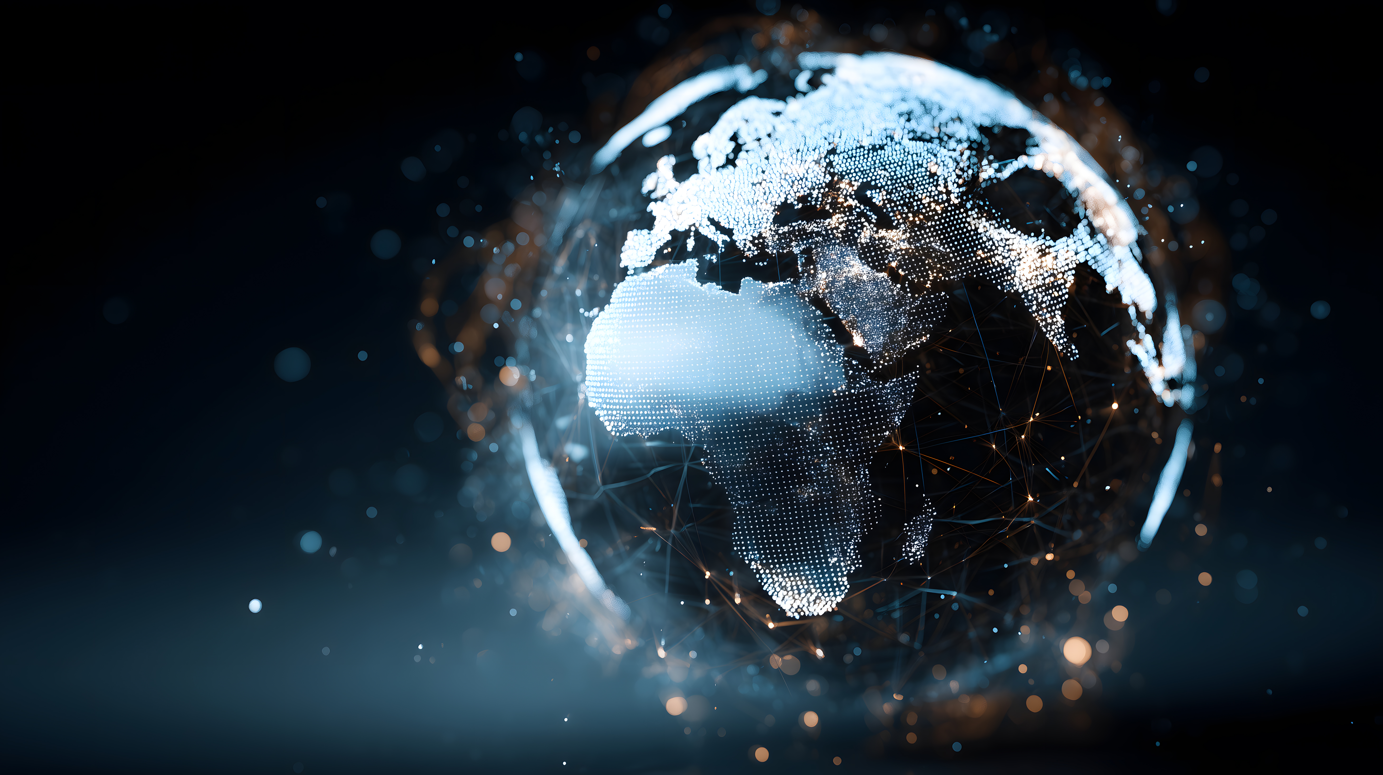 Das Bild zeigt eine futuristische, digitale Darstellung der Weltkugel, umgeben von einem Netzwerk aus leuchtenden Punkten. Diese abstrakte Visualisierung der Vernetzung unseres Planeten vermittelt einen Eindruck von Technologie, Innovation und Fortschritt. Der Erdball erscheint in kühlem Blau, durchzogen von einem Muster aus leuchtenden Linien, das eine moderne, digitale Ästhetik erzeugt.