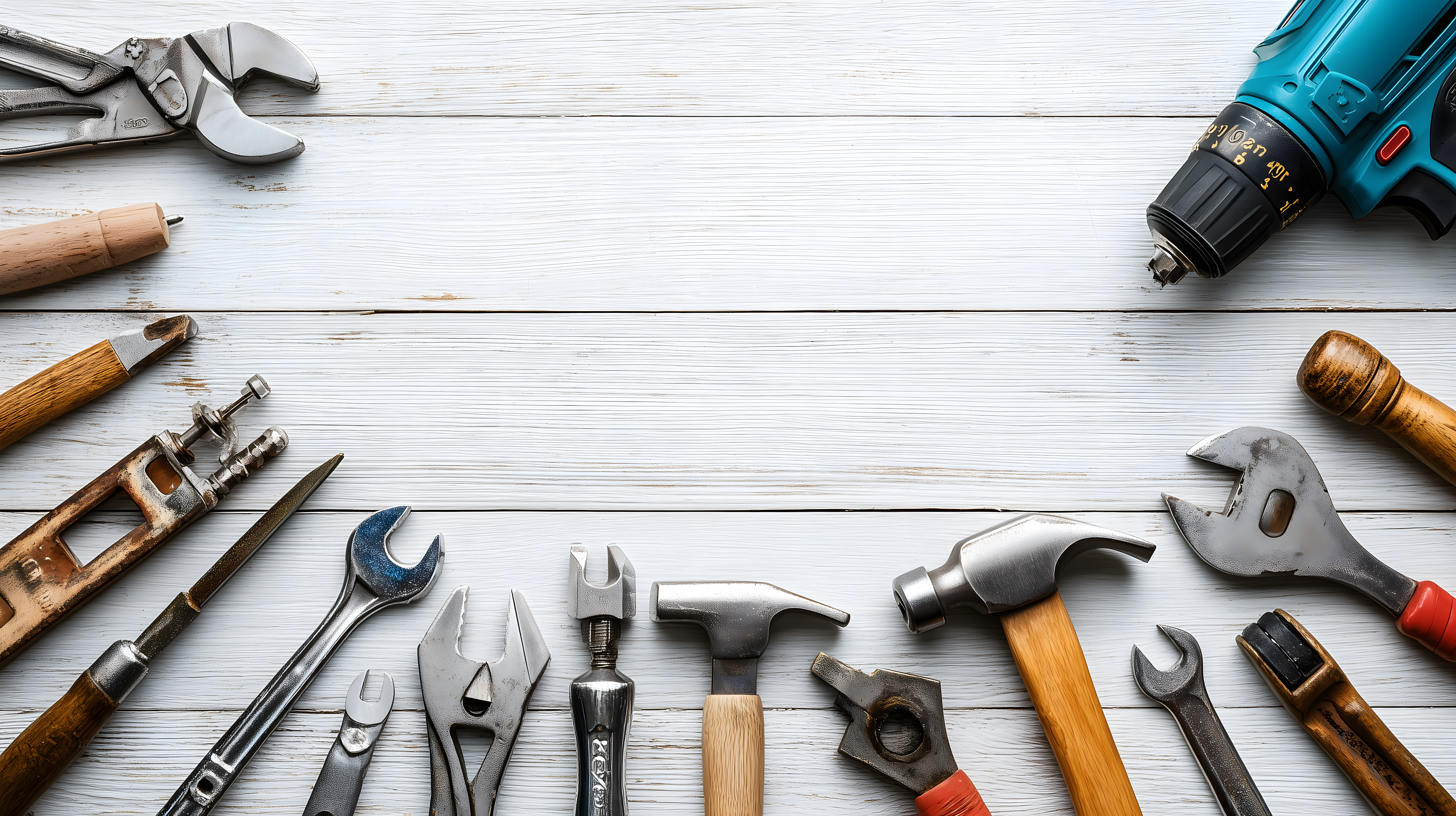 Das Bild zeigt eine Vielzahl von Werkzeugen, die auf einem hölzernen Hintergrund angeordnet sind. Die Werkzeuge umfassen Schraubenschlüssel, Zangen, Hämmer, Schraubendreher und eine Bohrmaschine. Die Anordnung der Werkzeuge lässt darauf schließen, dass es sich um einen Arbeitsplatz oder eine Werkbank handeln könnte. Die Holzstruktur im Hintergrund, kombiniert mit dem leicht abgenutzten Erscheinungsbild der Werkzeuge, verleiht dem Bild einen rustikalen, ländlichen Charakter. Dieses Stockfoto in hoher Auflösung und unter einer Creative-Commons-Lizenz eignet sich hervorragend für die Verwendung in Blogs, Newslettern, Social-Media-Beiträgen oder anderen Werbematerialien im Bereich des Handwerks, der Heimwerker-Themen oder der Baubranche.