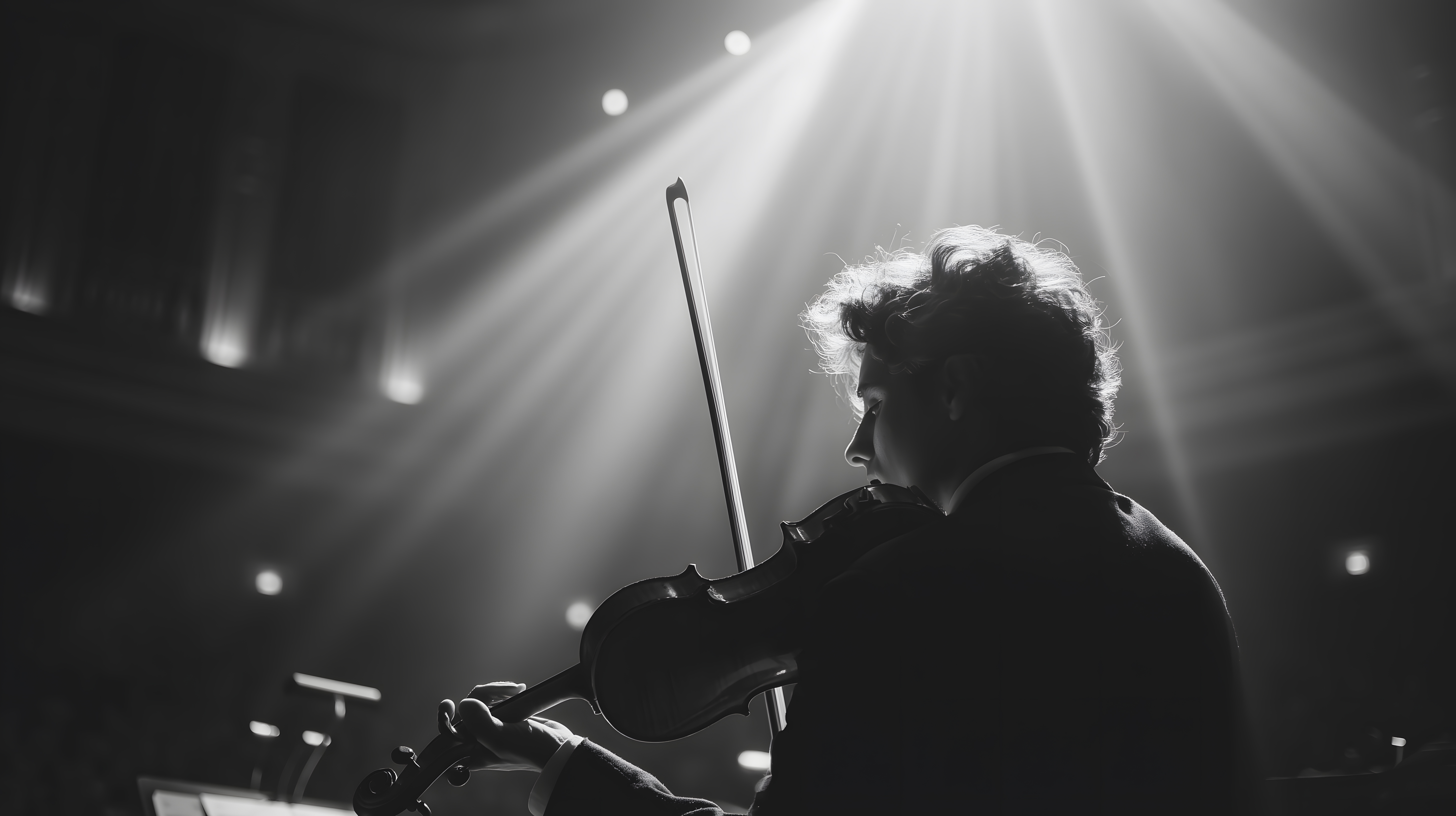 Dieses schwarz-weiße Foto zeigt einen Musiker, der Violine spielt, während er von Scheinwerfern beleuchtet wird. Die Beleuchtung wirft dramatische Schatten und Highlights auf den Künstler, der in Konzentration versunken scheint. Die Stimmung ist emotional und aufgeladen, typisch für eine Bühnenaufführung klassischer Musik. Dieses Stockfoto eignet sich hervorragend für die Verwendung in Blogbeiträgen, Newslettern oder Social-Media-Posts rund um das Thema Musik, Konzerte oder darstellende Kunst. Es ist in hoher Auflösung verfügbar und kann unter der Creative-Commons-Lizenz kostenlos genutzt werden.