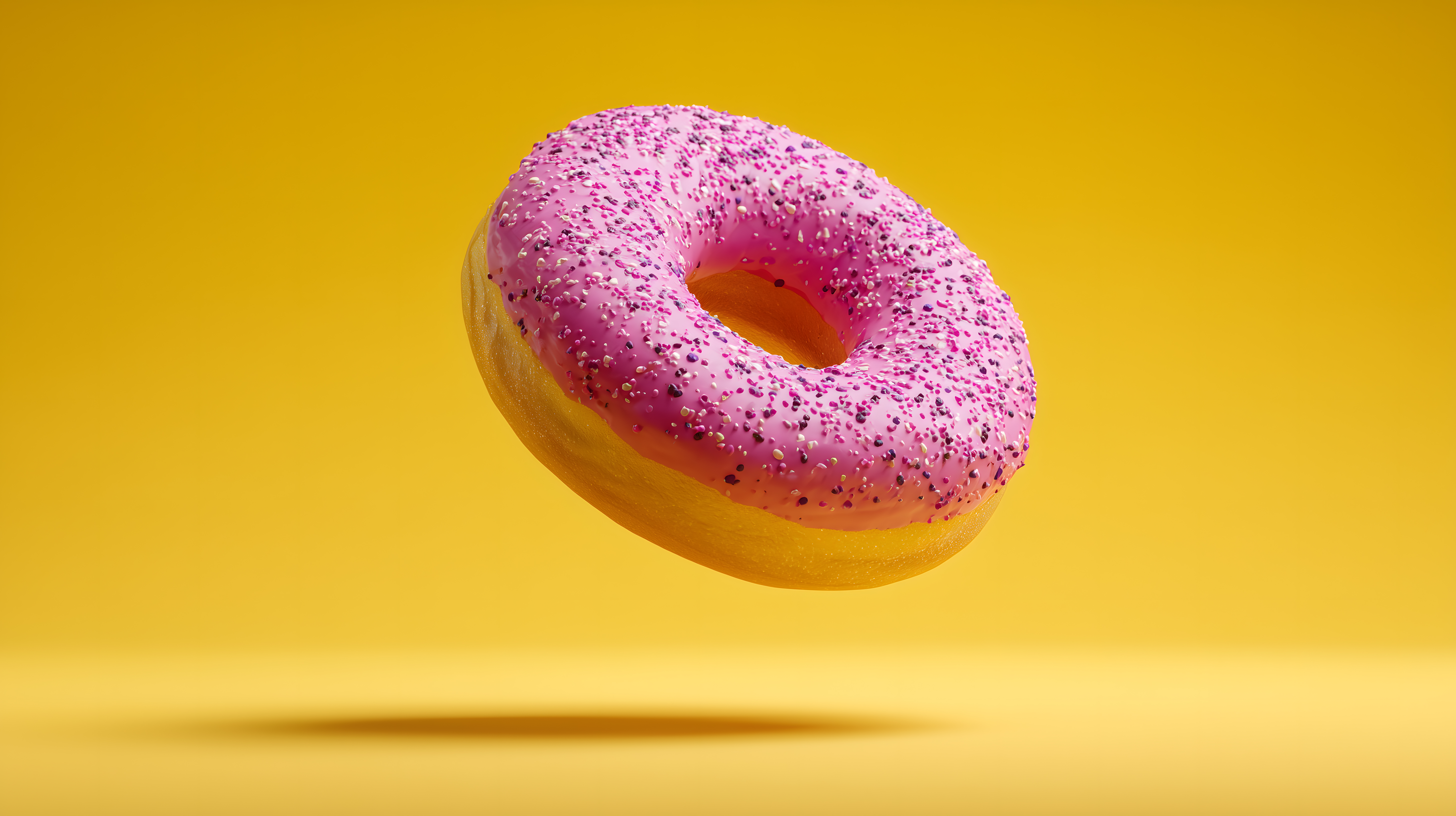 Das Bild zeigt einen köstlichen rosa Donut, der vor einem leuchtend gelben Hintergrund schwebend dargestellt wird. Der Donut ist mit einer kräftigen, dunkelrosa Glasur überzogen und mit feinen Streuseln bedeckt, was ihm ein besonders dekoratives Aussehen verleiht. Die ungewöhnliche Perspektive und der farbenfrohe Kontrast zwischen dem Donut und dem Hintergrund machen dieses Bild zu einem auffallenden und stimmungsvollen Eyecatcher, das sich hervorragend für den Einsatz in Blogs, Newslettern, Social-Media-Beiträgen oder Werbekampagnen rund um Backwaren, Süßspeisen und Snacks eignet.