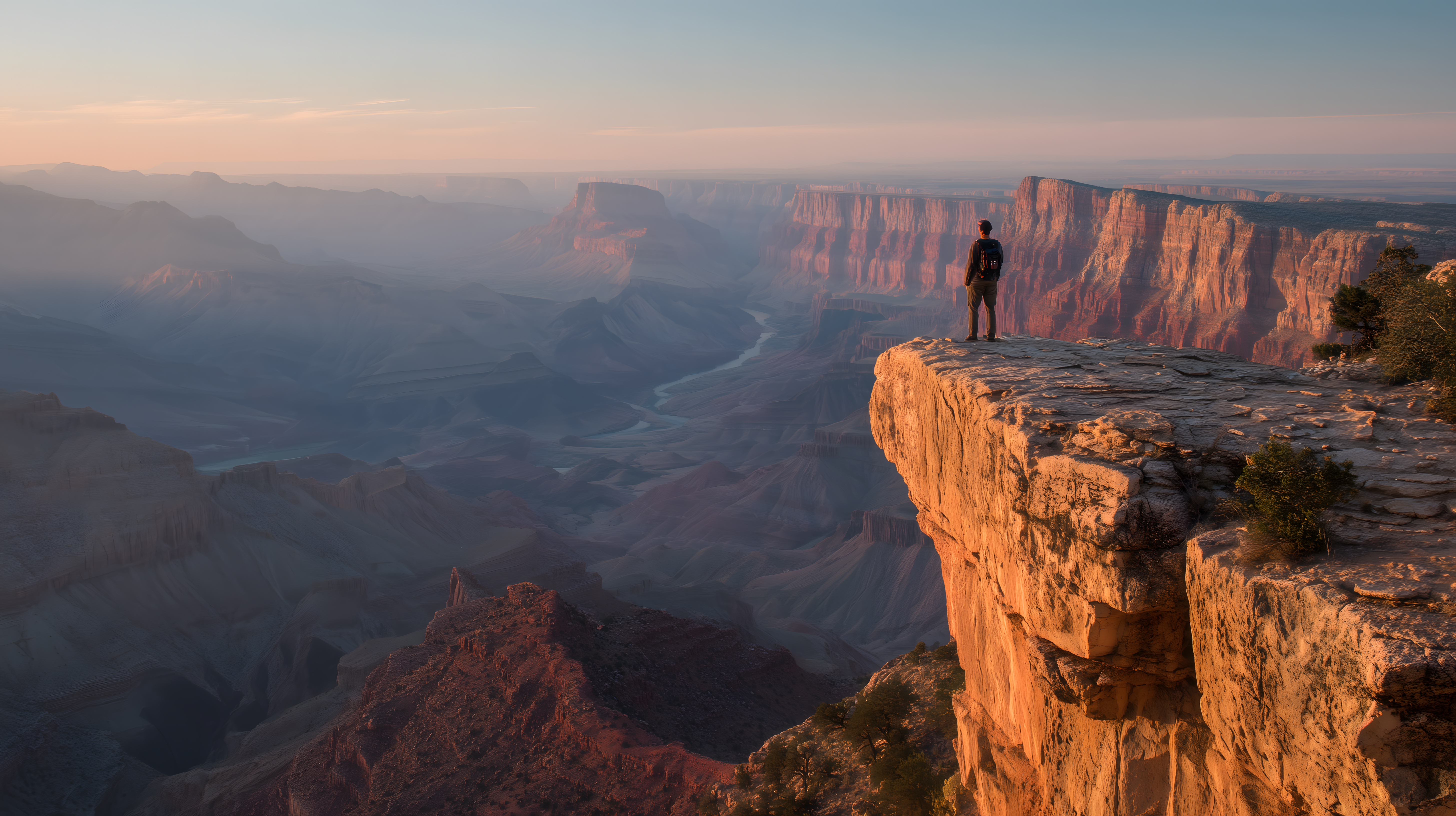 Das Foto zeigt einen einzelnen Wanderer, der auf einem Felsvorsprung steht und den Blick in den monumentalen Grand Canyon genießt. Die Morgensonne taucht die gewaltige Schlucht in ein warmes, orangefarbenes Licht und lässt die rötlichen Felsformationen fast glühen. Die Perspektive vom Felsvorsprung aus bietet einen beeindruckenden Ausblick über das weite Panorama des Canyons. Dieses außergewöhnliche Foto eignet sich perfekt für die Verwendung in Blogs, Newslettern oder Werbematerialien rund um das Thema Reisen, Abenteuer und Naturerlebnisse. Als hochauflösendes, kostenloses Stockfoto unter Creative-Commons-Lizenz kann es frei genutzt werden.