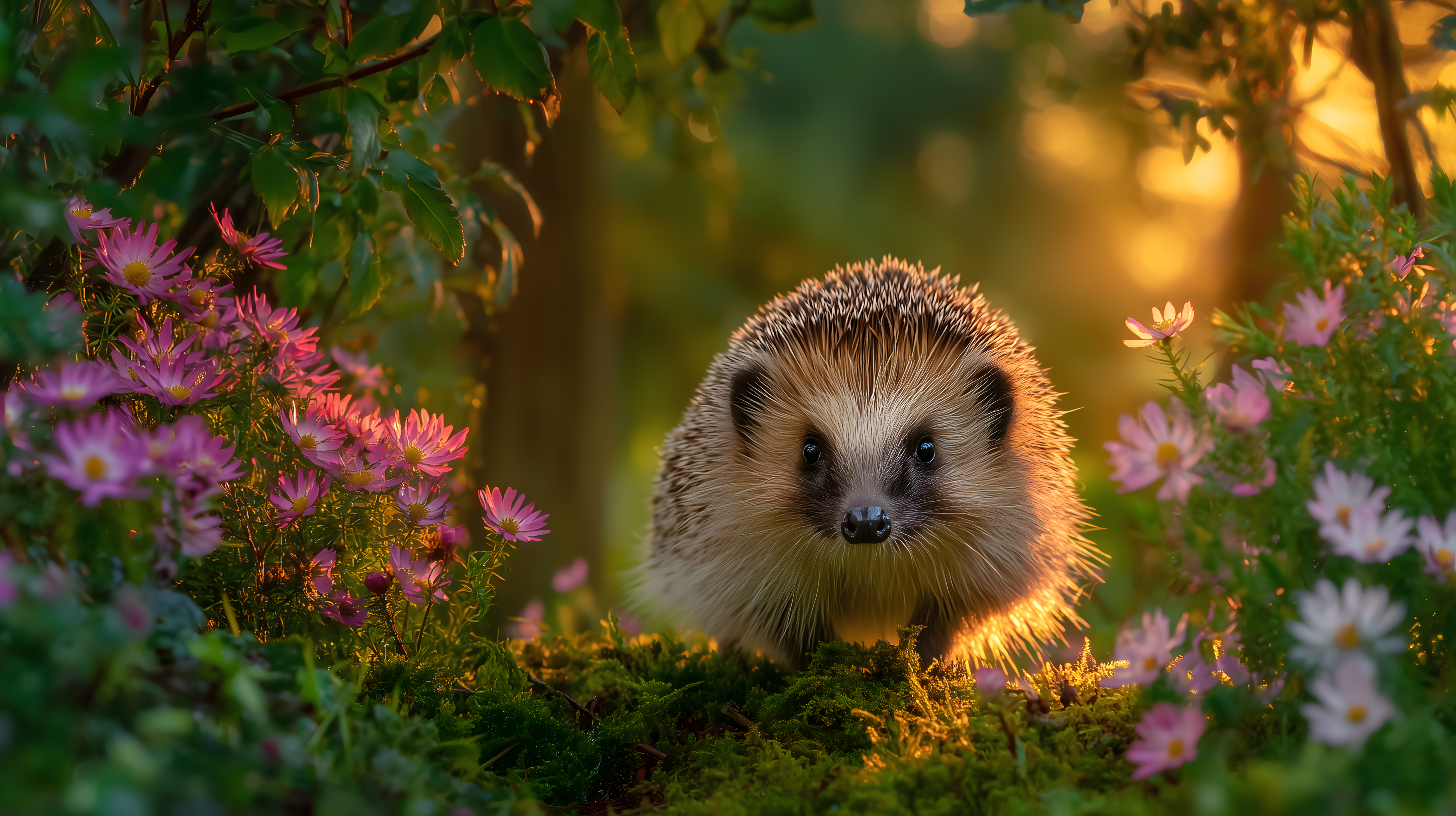 Dieses bezaubernde Bild zeigt einen Igel, der sich inmitten einer prachtvollen Frühlingslandschaft mit blühenden Blumen befindet. Der Igel ist umgeben von violetten Astern, weißen Margeriten und grünem Moos, welche die Szene in warmes, goldenes Licht tauchen. Der Fokus liegt klar auf dem stacheligen Säugetier, dessen sanfter Blick den Betrachter in seinen Bann zieht. Diese idyllische Aufnahme vermittelt eine Stimmung von Ruhe und Harmonie in der Natur und eignet sich perfekt als kostenloses Stockfoto für Blogs, Newsletter oder Social-Media-Posts rund um Themen wie Tierwelt, Garten oder Frühling. Das hochauflösende Bild ist unter einer Creative-Commons-Lizenz frei verwendbar.