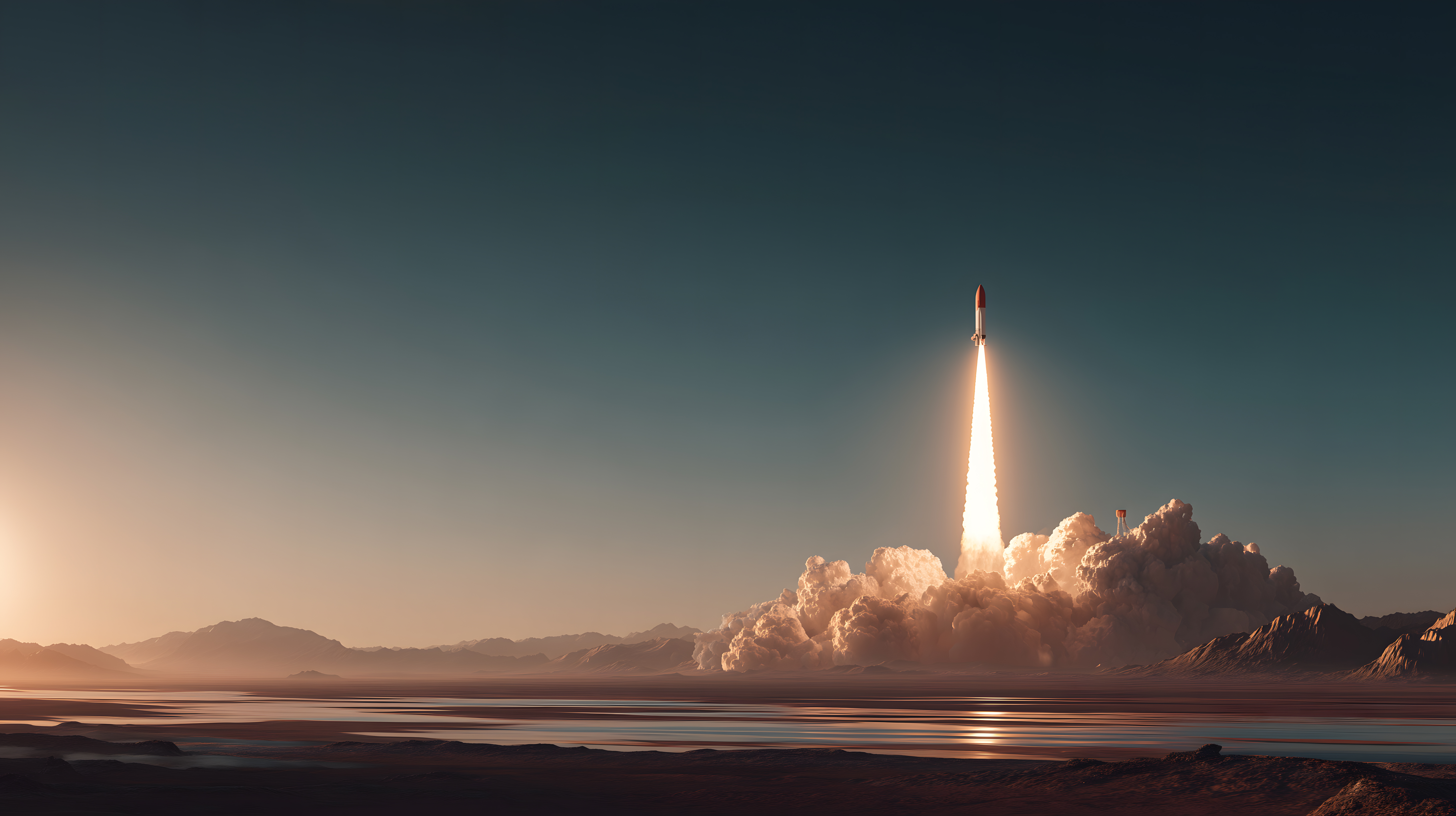 Dieses beeindruckende Foto zeigt den Start einer Rakete vor einem malerischen Sonnenuntergangshimmel. Die mächtige Rakete erhebt sich in den Himmel, umhüllt von einer gewaltigen Rauchwolke. Im Vordergrund erstreckt sich eine ruhige Wasserfläche, die die Umgebung in einem warmen, orangefarbenen Licht erstrahlen lässt. Die felsige Berglandschaft im Hintergrund verleiht der Szene eine majestätische Atmosphäre und unterstreicht den Eindruck von Größe und Kraft.