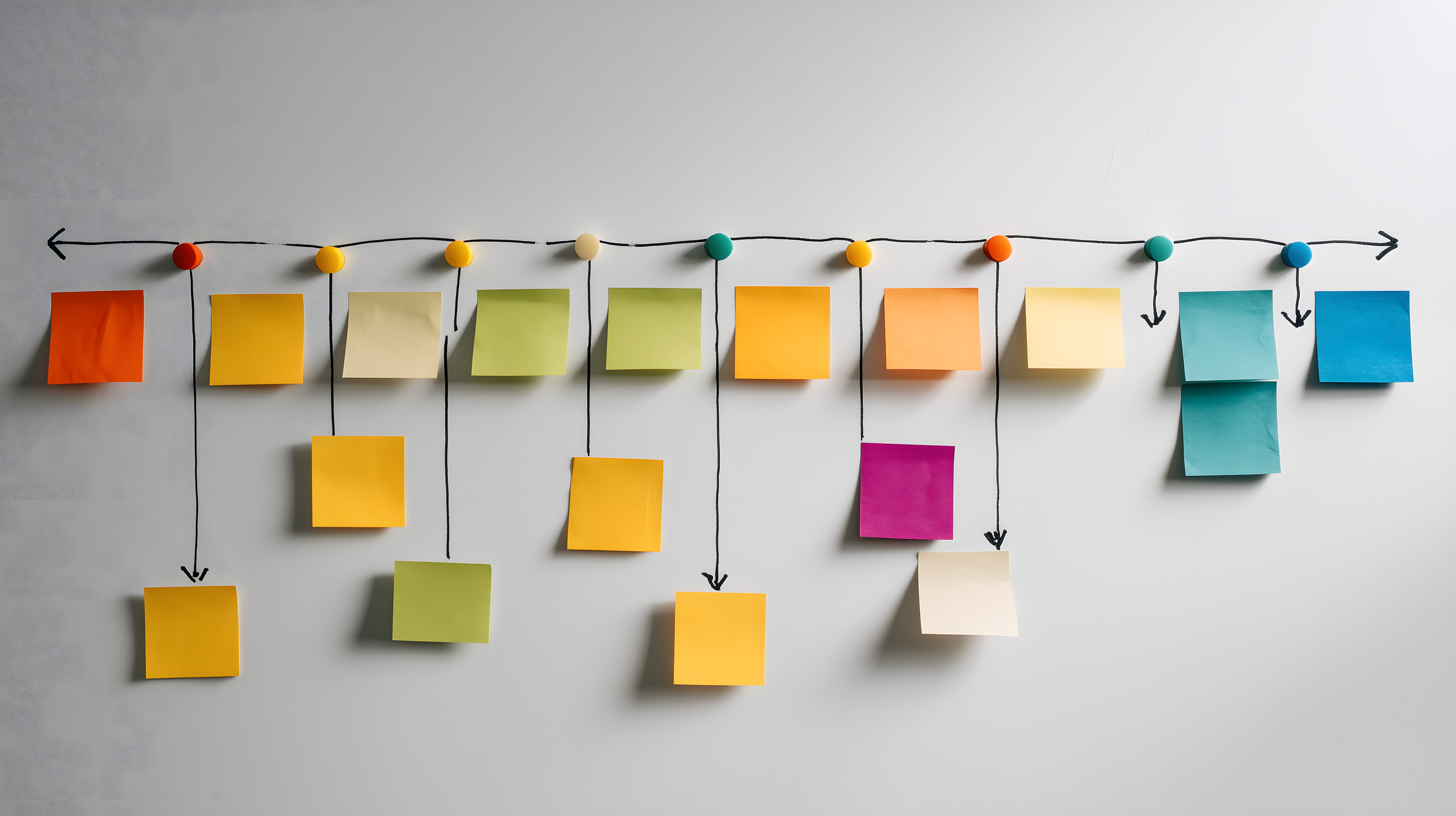 Dieses Stockfoto zeigt eine bunte, visuelle Zeitstrahl-Darstellung mit Haftnotizen in verschiedenen Farben. Die Notizen sind an einem Draht aufgehängt, der in Richtung Pfeilspitzen weist. Dieser minimalistisch gestaltete Arbeitsbereich bietet eine strukturierte Übersicht, die für Projektmanagement, Brainstorming oder Terminplanung genutzt werden kann. Die Farbpalette aus Orange, Gelb, Grün, Blau und Pink verleiht dem Bild einen kreativen, frischen Charakter und eignet sich hervorragend für Blog-Beiträge, Newsletter-Designs oder Social-Media-Posts. Als hochauflösendes Stockfoto unter der Creative-Commons-Lizenz ist dieses Bild für verschiedenste Verwendungszwecke frei nutzbar.