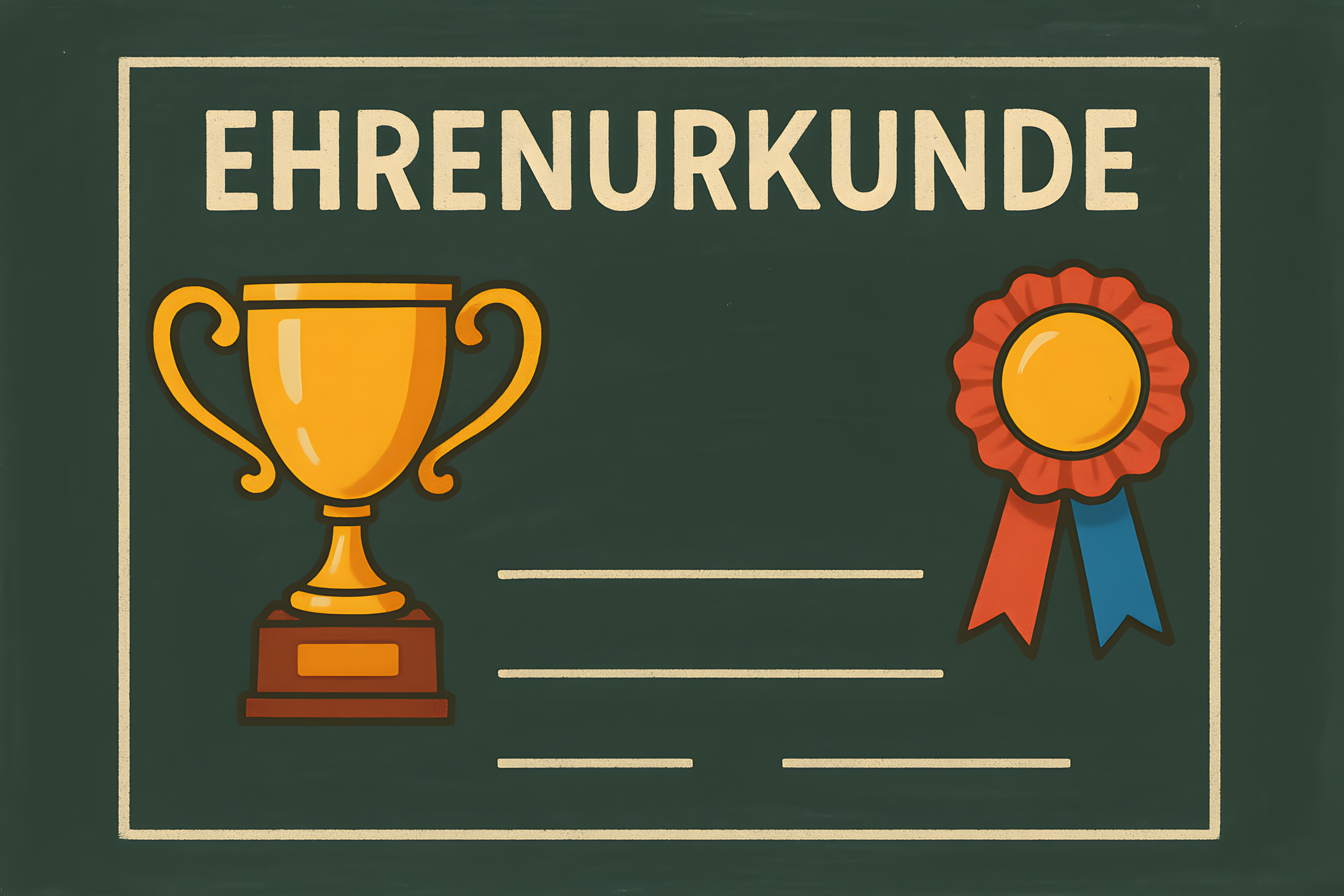 Dieses Stockfoto zeigt eine Ehrenurkunde auf einer grünen Tafel. Das Bild hat eine klassische, vintage-inspirierte Optik mit warmen Farbtönen. Im Vordergrund ist ein goldener Pokal zu sehen, der von einer roten Schleife umgeben ist. Oben auf der Tafel steht in großen Lettern 'EHRENURKOUNDE', was auf einen besonderen Leistungsnachweis oder eine Auszeichnung hindeutet.