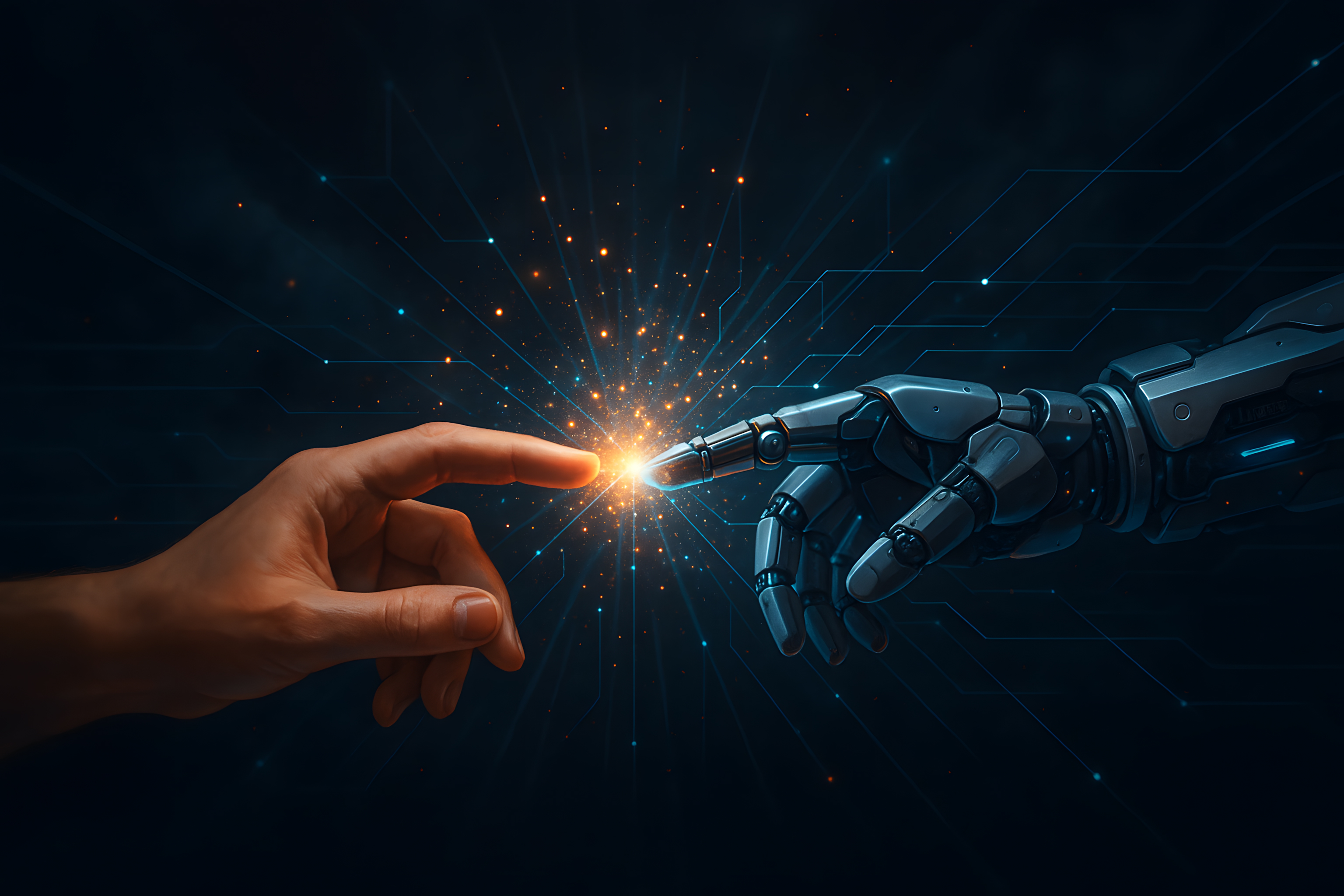 Das Bild zeigt einen beeindruckenden Moment, in dem ein Mensch und ein Roboterarm gemeinsam eine Energiequelle erschaffen. In der Szene verschmelzen Mensch und Maschine, um neue Möglichkeiten zu erschließen. Die Funken, die aus der Berührung zwischen den beiden entstehen, symbolisieren den Funken der Kreativität und Innovation, der durch die Zusammenarbeit von Mensch und Technologie entsteht.
