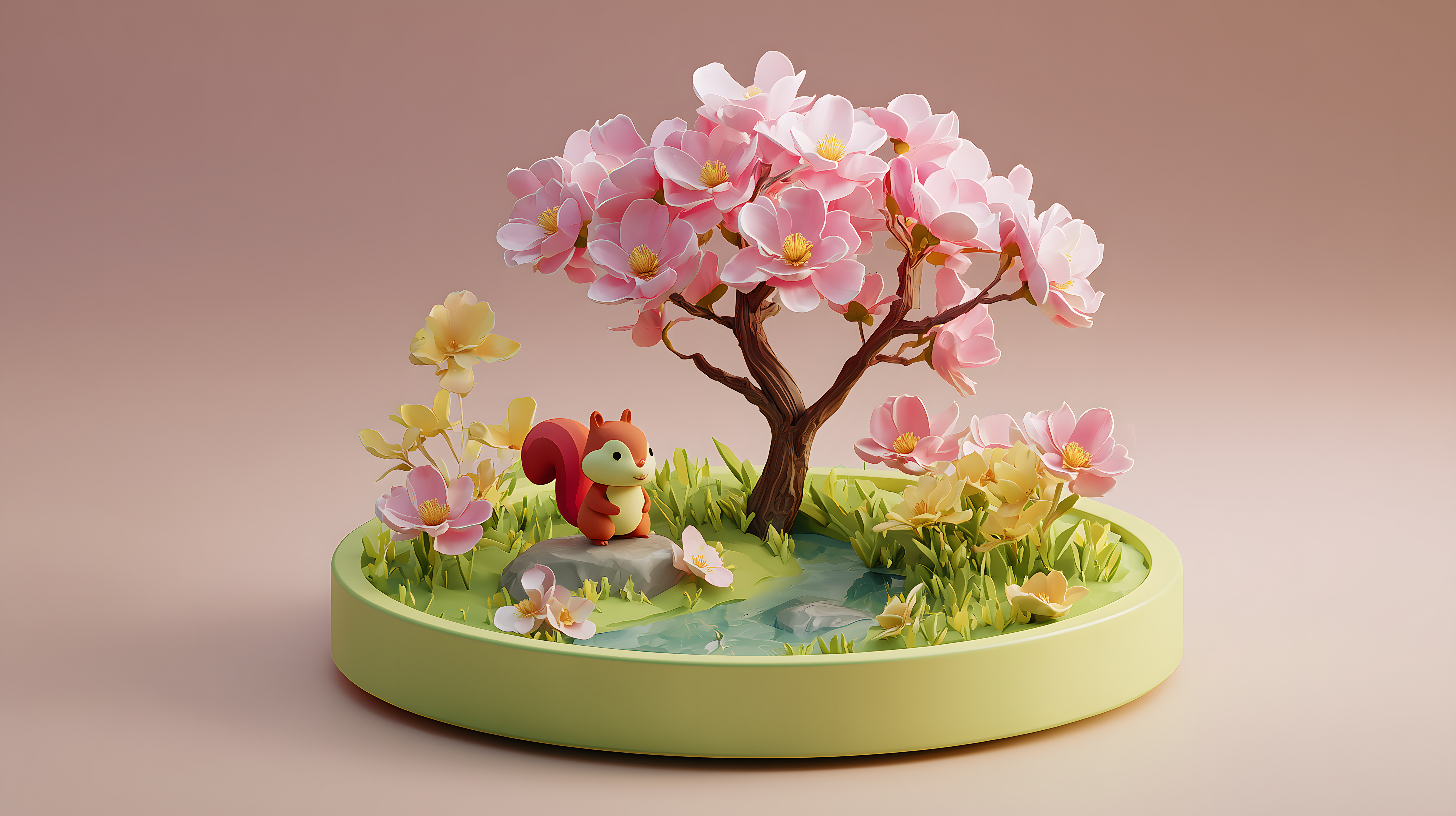 Dieses stimmungsvolle Foto zeigt eine idyllische Frühlingsszene mit einem blühenden Bonsai-Baum als Mittelpunkt. Die zarten, rosa Blüten des Baums rahmen ein friedliches Arrangement aus Gras, bunten Blumen und einem niedlichen Eichhörnchen, das sich zwischen den Pflanzen versteckt. Die Komposition ist detailliert und kreativ gestaltet, mit einer pastelligen Farbpalette, die eine sanfte, beruhigende Atmosphäre schafft. Dieses Foto wäre perfekt für Blogs, Newsletter, Social-Media-Beiträge oder Werbematerialien zum Thema Frühling, Natur, Gartengestaltung oder Ökologie. Es ist ein kostenloses Stockfoto in hoher Auflösung und unter einer Creative-Commons-Lizenz verfügbar.