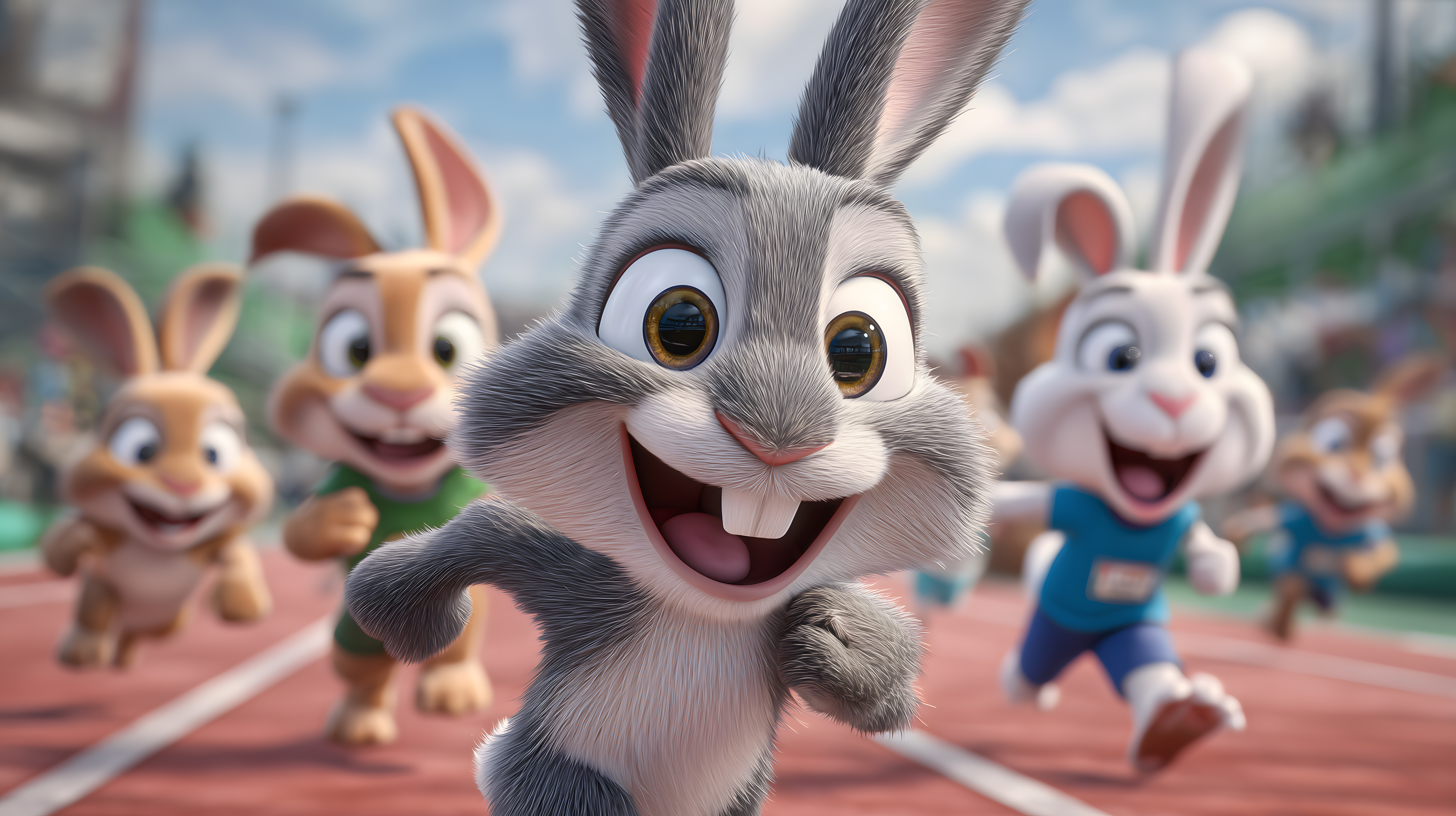 Das Bild zeigt eine fröhliche Szene mit mehreren Cartoon-Hasen, die an einer Sportveranstaltung teilnehmen. Die Tiere laufen auf einer Rennstrecke in einem Stadion und scheinen einen Wettkampf auszutragen. Ihre lebendige Darstellung mit großen, ausdrucksstarken Augen und offenen Mündern vermittelt Dynamik, Spaß und Spielfreude. Die bunte, detaillierte Grafik in pastelligen Farbtönen passt perfekt zu dem heiteren, animierten Stil. Dieses kostenlose Stockfoto in hoher Auflösung unter Creative-Commons-Lizenz eignet sich hervorragend für den Einsatz in Blogs, Newslettern, Social-Media-Beiträgen oder Werbekampagnen mit Bezug zu Themen wie Sport, Wettbewerb, Freude oder Frühling.
