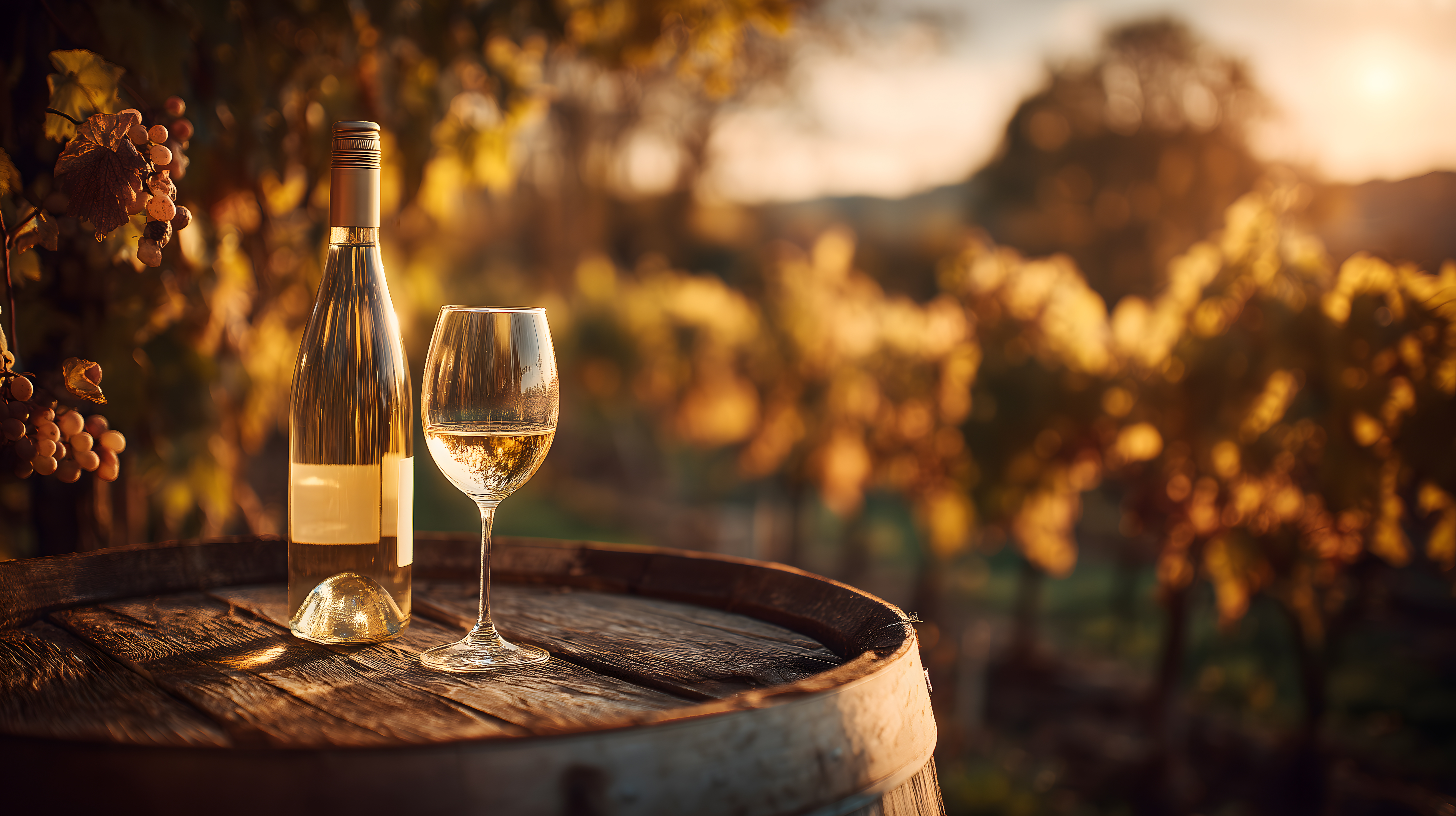 Das Bild zeigt eine idyllische Weinverkostung bei Sonnenuntergang in den Weinbergen. Im Vordergrund sieht man ein Weinfass, auf dem eine Weinflasche und ein Weinglas stehen. Im Hintergrund erstreckt sich eine wunderschöne Weinlandschaft mit gelblichen Blättern und warmer Abendsonne. Das Foto vermittelt eine entspannte, genussvolle Atmosphäre und lädt dazu ein, die Seele baumeln zu lassen. Das hochauflösende Stockfoto ist unter einer Creative-Commons-Lizenz frei nutzbar und eignet sich perfekt für den Einsatz in Blogs, Newslettern, Social-Media-Kanälen oder Werbekampagnen rund um das Thema Wein und Weinkultur.