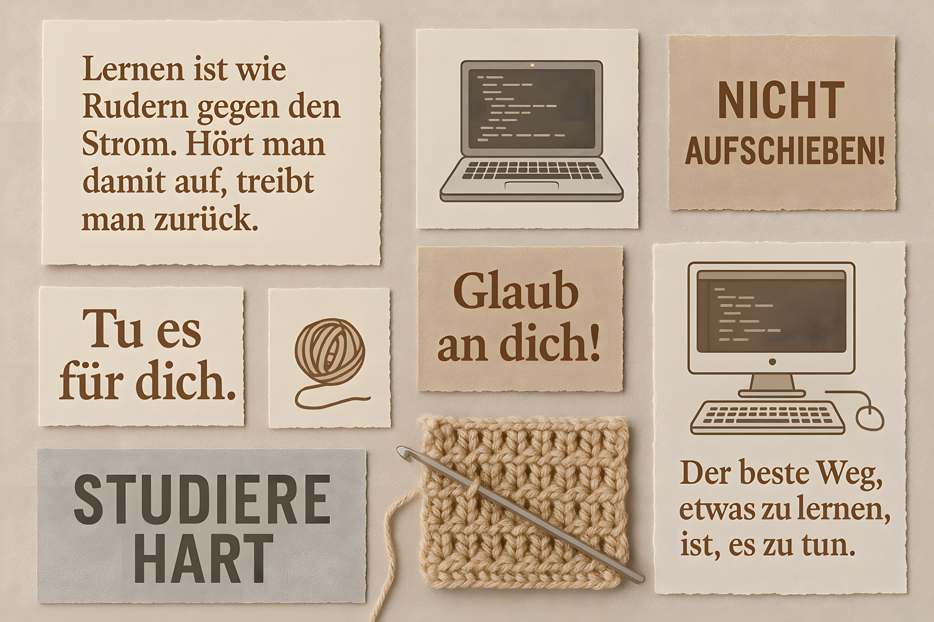 Dieses Foto zeigt ein Motivations-Mood-Board mit einer Sammlung von Sprüchen, Grafiken und Illustrationen, die Inspiration und Ermutigung zum Lernen und Weiterbilden vermitteln. Das Poster verwendet einen rustikalen, handgefertigten Stil mit Texturen aus Papier und Karton, der dem Ganzen einen authentischen, vintage-inspirierten Charakter verleiht. Die Zitate und Botschaften sprechen verschiedene Aspekte des Lernens und der persönlichen Entwicklung an - vom Überwinden von Herausforderungen bis hin zur Bedeutung von Ausdauer und Glauben an sich selbst. Dieses hochauflösende Stockfoto in hoher Qualität eignet sich hervorragend für Blogs, Newsletter, Social-Media-Posts oder Werbematerialien rund um die Themen Motivation, Bildung und Selbstverbesserung. Es steht unter einer Creative-Commons-Lizenz zur freien Nutzung zur Verfügung.