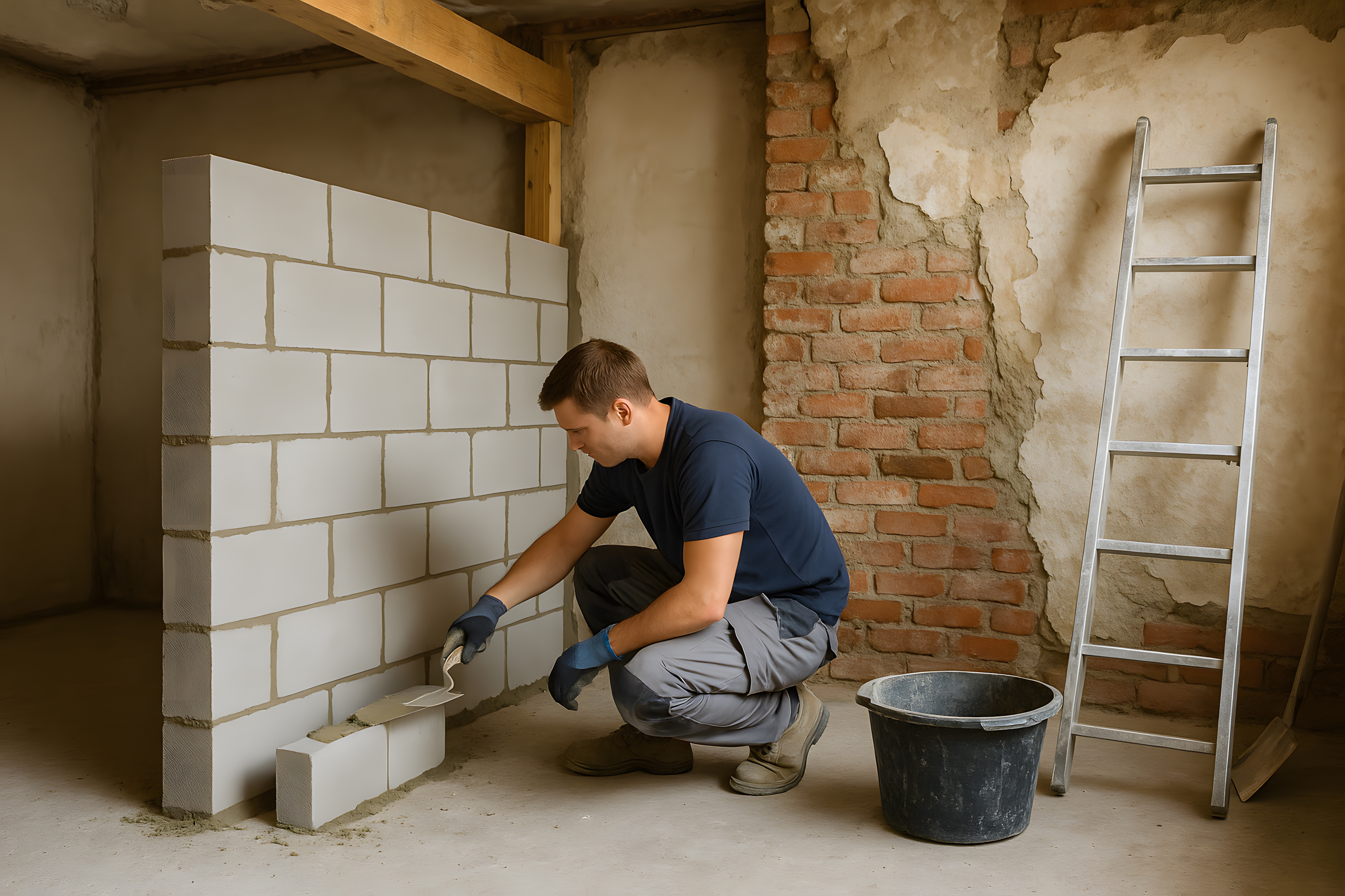Das Bild zeigt einen Handwerker, der beim Mauerbau in einem Rohbau mit Ziegelsteinen und einer Maurerkelle arbeitet. Im Hintergrund ist eine Ziegelwand und eine Leiter zu sehen, die auf eine weitere Arbeitsebene hinweist. Das Foto vermittelt einen authentischen Eindruck vom Prozess des Mauerns und der Vorbereitung einer Baustelle. Dieses hochauflösende Stockfoto eignet sich hervorragend für Veröffentlichungen rund um das Thema Bauhandwerk, Renovierung, Innenausbau oder Heimwerken. Es steht unter einer Creative-Commons-Lizenz zur kostenlosen Nutzung zur Verfügung.
