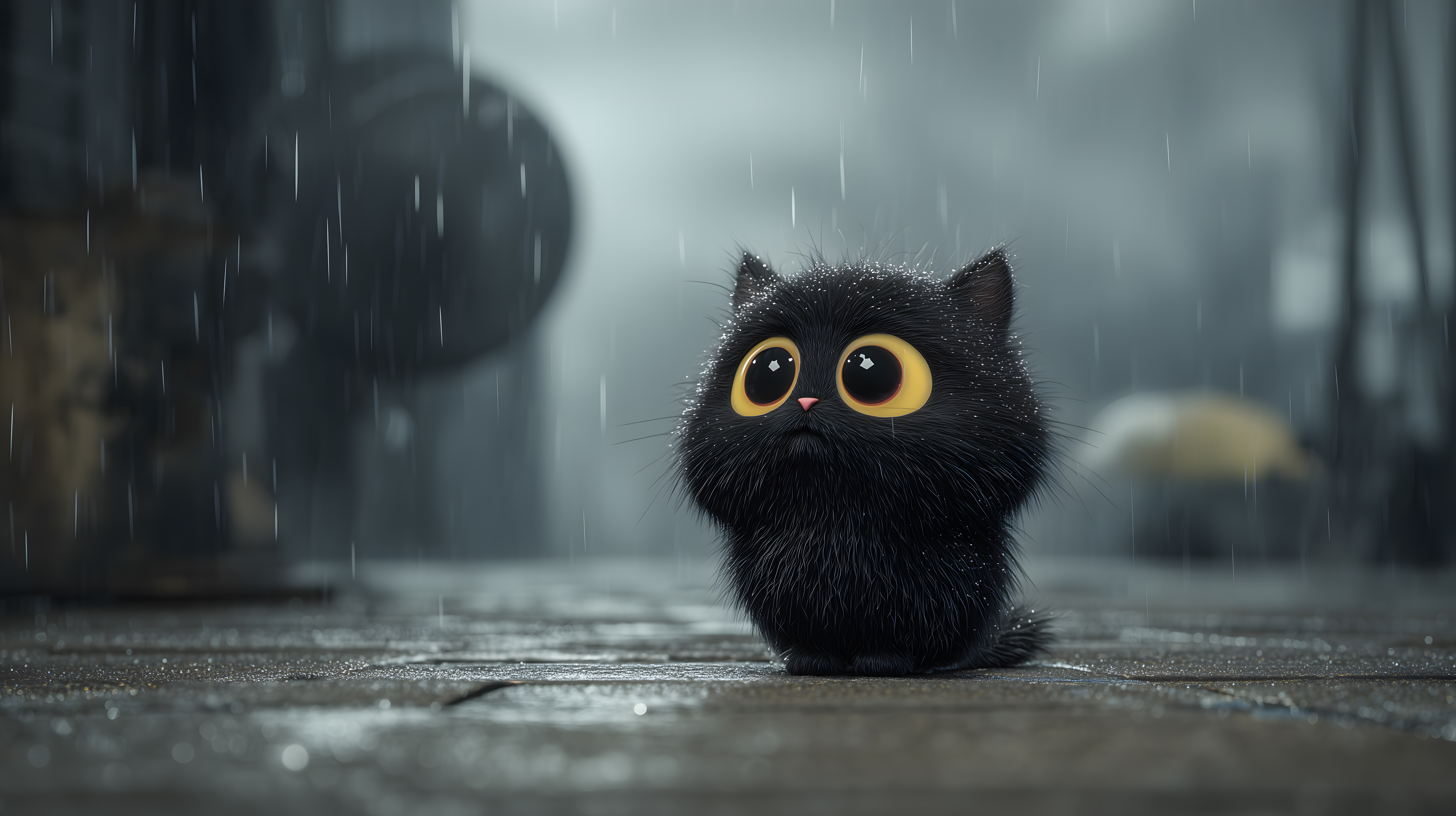 Das Foto zeigt eine kleine, flauschige schwarze Katze, die inmitten eines Regengusses auf einer nassen Straße sitzt. Die Katze hat große, ausdrucksstarke Augen, die den Betrachter direkt anzuschauen scheinen. Der Regen fällt in dichten Tropfen, die die Umgebung leicht verschwommen erscheinen lassen. Die Szene vermittelt eine melancholische, aber zugleich auch bezaubernde Stimmung.