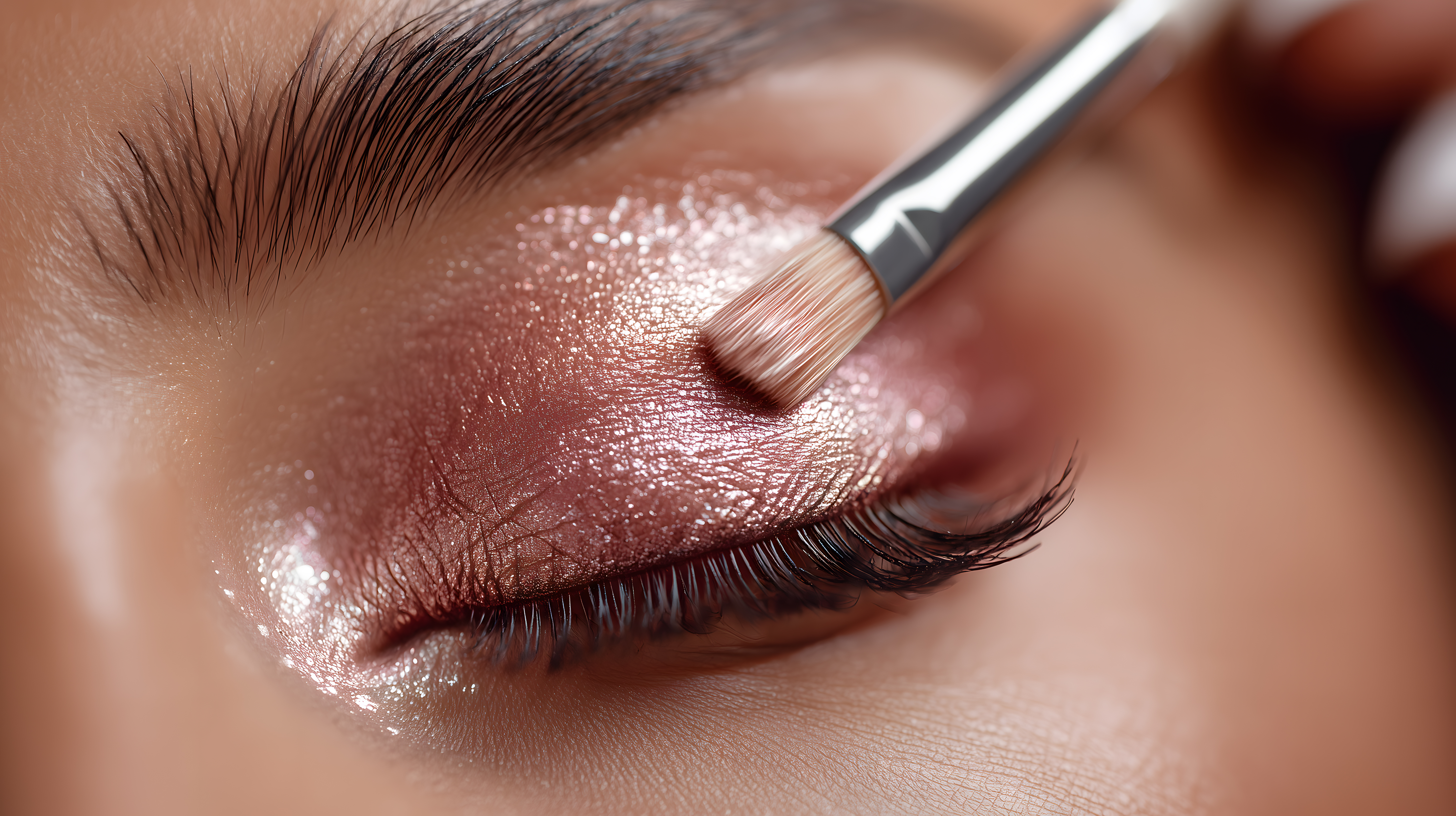 Das Foto zeigt eine Nahaufnahme einer Frau, die mit einem Pinsel einen bronzefarbenen, schimmernden Lidschatten auf ihr Augenlid aufträgt. Die Perspektive ist sehr nah und fokussiert, sodass man die Textur und den Glanz des Lidschattens sowie die feinen Wimpern und Augenbrauen deutlich erkennen kann. Das Bild vermittelt einen professionellen, ästhetischen Eindruck und könnte beispielsweise für Beauty-Blogs, Werbung für Kosmetikprodukte oder Social-Media-Beiträge zu Schönheitsthemen verwendet werden. Als hochwertiges, kostenloses Stockfoto unter der Creative-Commons-Lizenz ist es für vielfältige Einsatzzwecke geeignet.