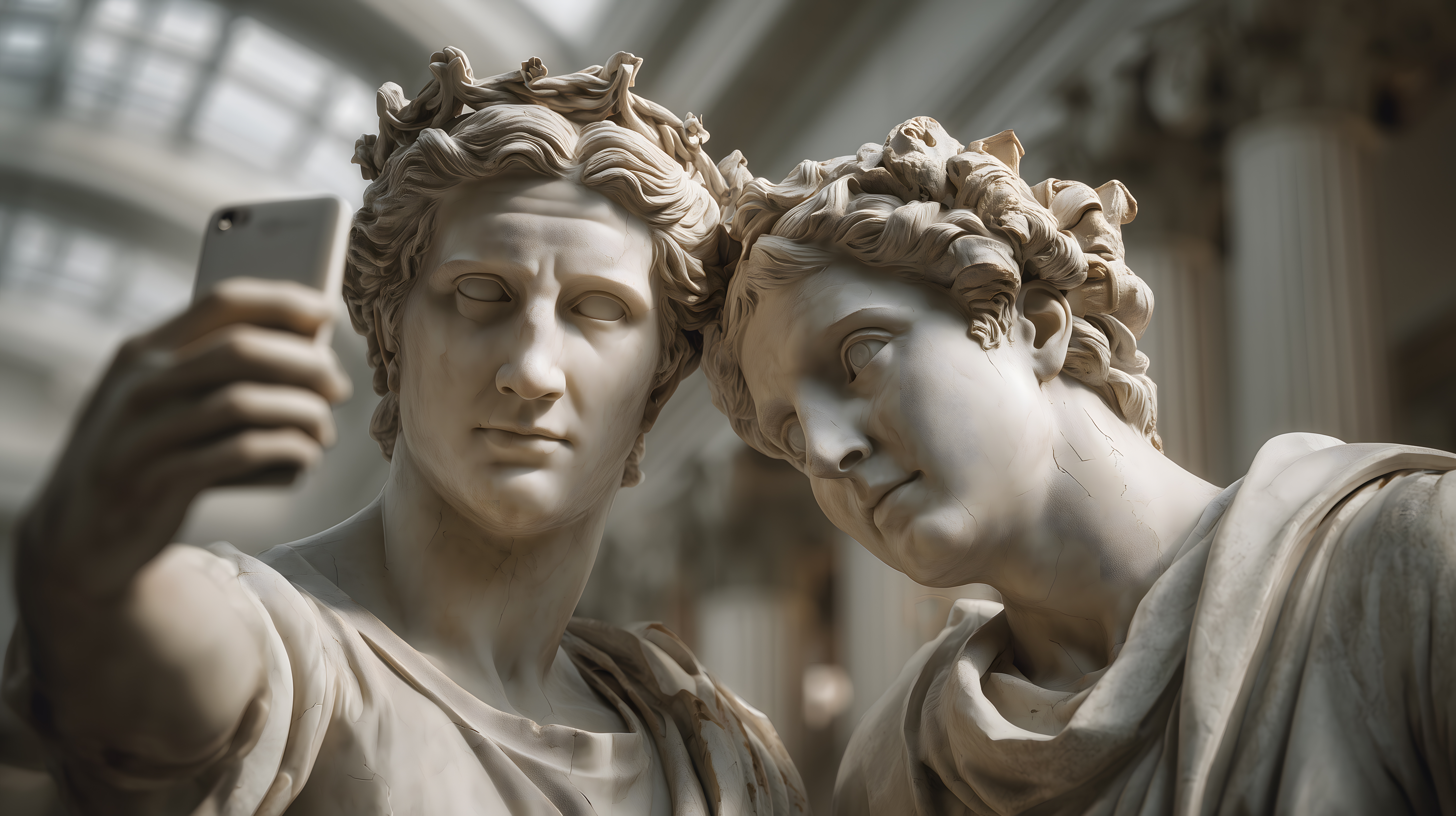 Das Bild zeigt zwei detailreich gemeißelte Marmorskulpturen, die scheinbar gemeinsam ein Selfie mit einem modernen Smartphone aufnehmen. Die lebendigen Gesichtszüge und die sorgfältig gestalteten Haarstrukturen verleihen den mythologischen Figuren eine überraschend lebendige Anmutung, die durch den Kontrast mit dem zeitgenössischen Accessoire noch verstärkt wird. Das ungewöhnliche Motiv lässt den Betrachter schmunzeln und bietet zahlreiche kreative Einsatzmöglichkeiten, etwa für Blogs, Social-Media-Beiträge oder Werbeanzeigen rund um Themen wie Kunst, Kultur und Technologie. Dieses kostenlose, hochauflösende Stockfoto steht unter der Creative-Commons-Lizenz zur Verfügung und kann frei genutzt werden.