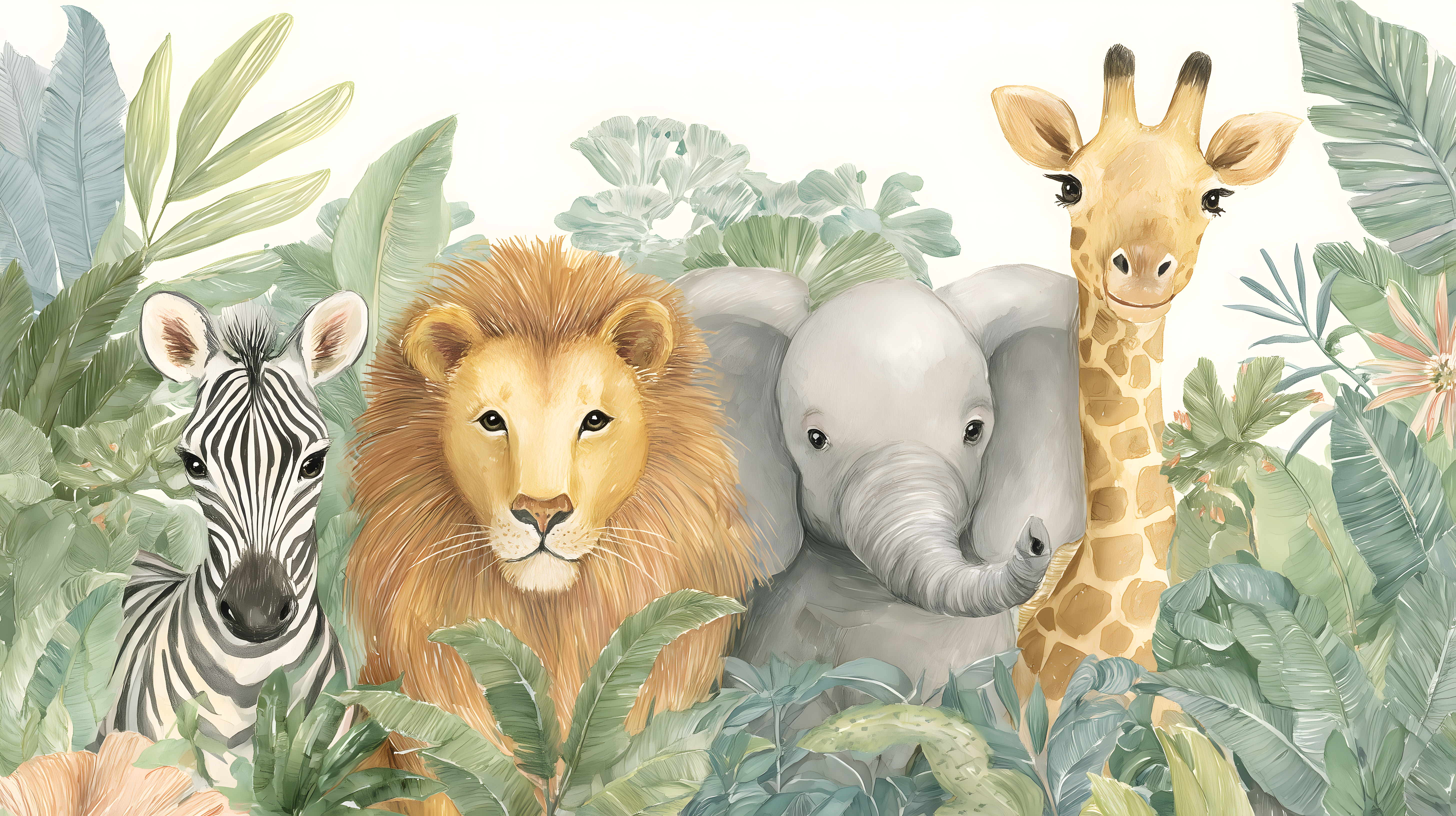 Dieses farbenfrohe Illustrationsbild zeigt eine Gruppe von Dschungeltieren in einer üppigen Blätterkulisse. Im Vordergrund sind ein Löwe, eine Giraffe, ein Zebra und ein Elefant zu sehen, umgeben von tropischen Pflanzen und Blättern in zarten Pastellfarben. Die Tiere sind liebevoll und detailliert gezeichnet und blicken den Betrachter mit großen, ausdrucksstarken Augen an. Das Bild vermittelt eine fantasievolle, naturnahe Atmosphäre und eignet sich hervorragend für die Verwendung in Kinderbüchern, Märchen-Illustrationen, als Wandbild oder auf Geschenkpapier. Als kostenloses Stockfoto in hoher Auflösung unter Creative-Commons-Lizenz ist es sehr vielseitig einsetzbar.