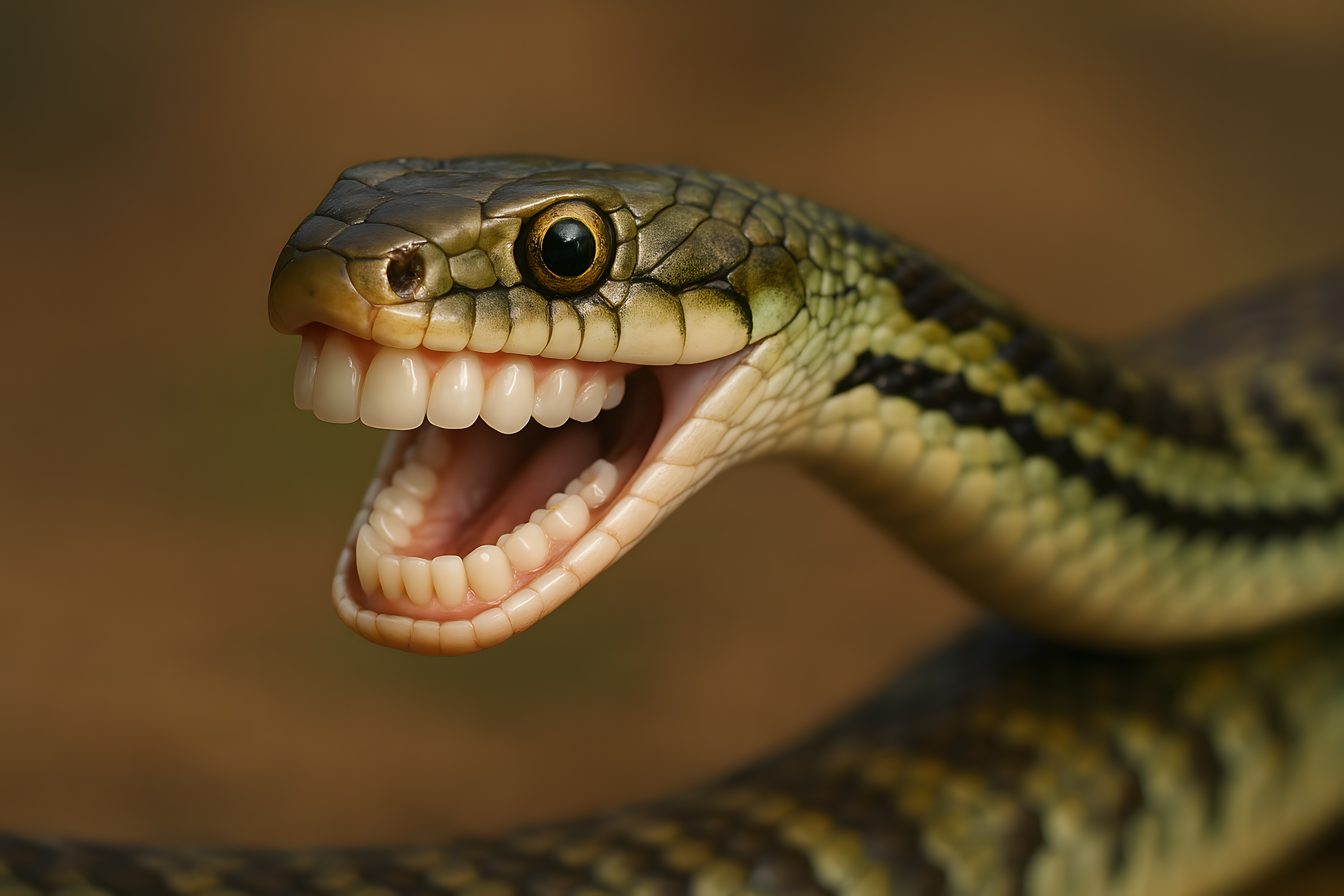 Dieses faszinierende Bild zeigt eine schlangenähnliche Kreatur mit beängstigend menschlichen Zähnen. Die Nahaufnahme ermöglicht einen detaillierten Blick auf das Maul des Wesens, dessen Augen tief und durchdringend wirken. Die Farbgebung in Braun- und Gelbtönen verleiht dem Bild eine surreale und bedrohliche Atmosphäre. Diese außergewöhnliche Darstellung eines fiktiven Tieres könnte hervorragend für Horrorgeschichten, Fantasy-Illustrationen oder als Titelbild für Publikationen zu fantastischen Themen verwendet werden. Das hochauflösende Stockfoto steht unter einer Creative-Commons-Lizenz kostenlos zur Verfügung.