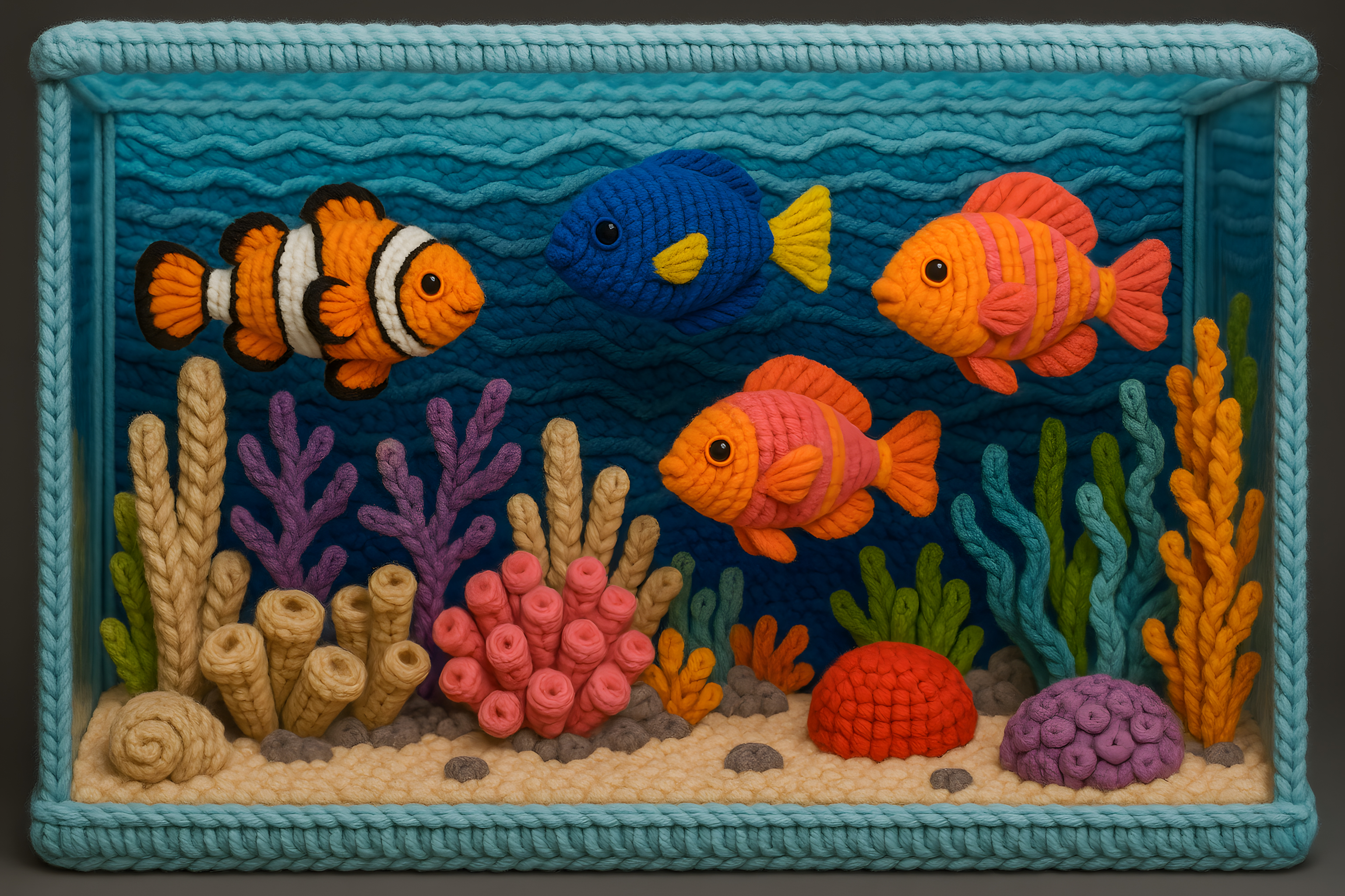 Dieses detailreiche Wandbild zeigt eine bunte, lebendige Meereswelt aus Garn. Verschiedenfarbige, kunstvolle Fische schwimmen zwischen grünen Algen und farbenfrohen Korallen. Das Bild besticht durch sein dreidimensionales, handgefertigtes Aussehen und seine vielen Textureffekte. Es eignet sich hervorragend als dekorative Gestaltung für Kinderzimmer, Büros oder Wohnzimmer und verleiht jedem Raum einen maritimen, kreativen Charme. Als hochwertiges Stockfoto in kostenloser, frei nutzbarer Qualität kann es einfach in Blogs, Newsletter oder Social-Media-Beiträge eingebunden werden.