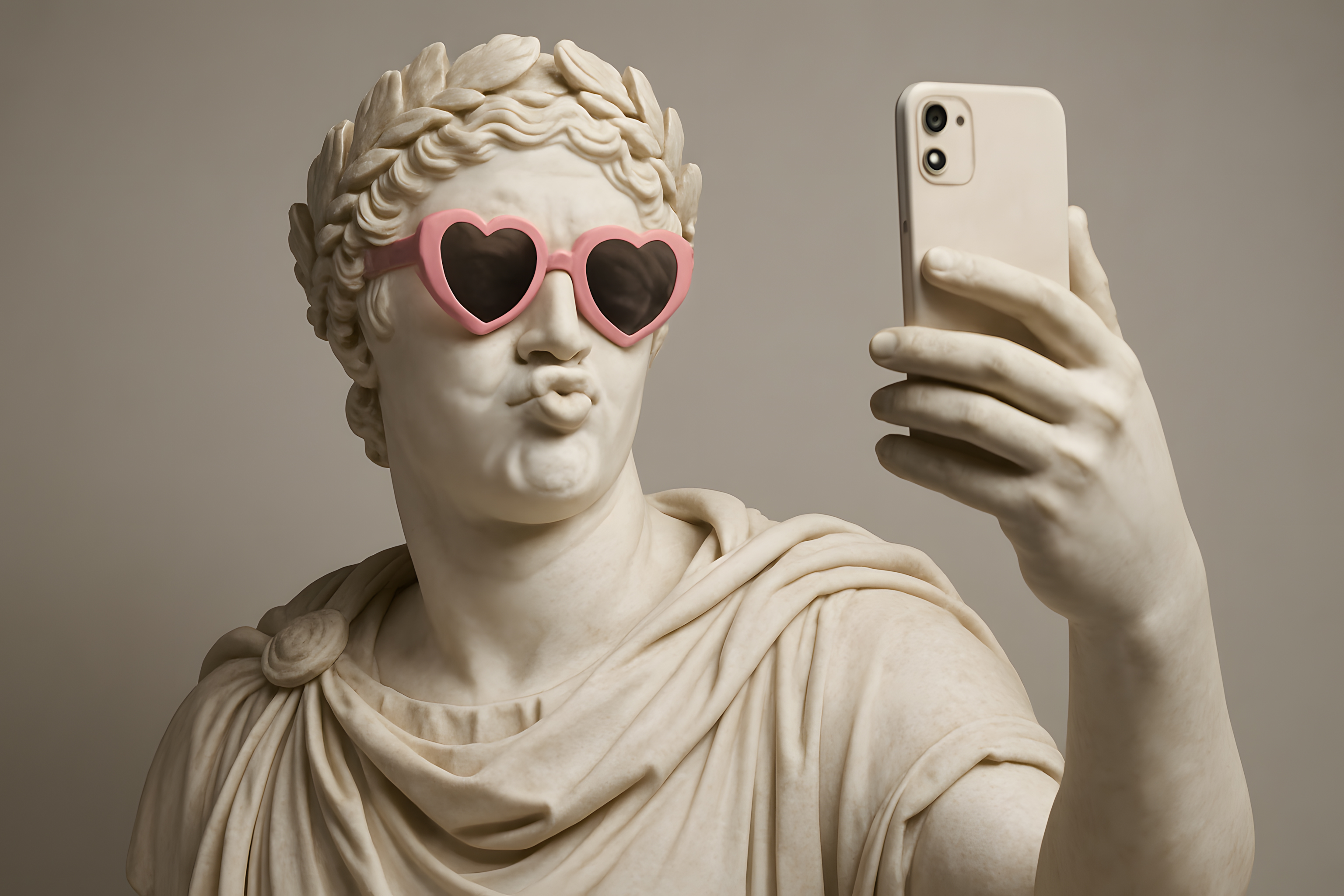 Dieses einzigartige Kunstbild zeigt eine antike Statue, die ein modernes Selfie mit einer rosa Herz-Sonnenbrille macht. Der Kontrast zwischen der klassischen, weißen Skulptur und der zeitgenössischen Pose und Accessoires schafft einen humorvollen und kreativen Blick auf das Thema. Das Foto bietet vielfältige Einsatzmöglichkeiten, z.B. für Blogs, Social-Media-Beiträge oder Werbezwecke. Es ist in hoher Auflösung und unter einer Creative-Commons-Lizenz verfügbar, sodass es kostenfrei genutzt werden kann.