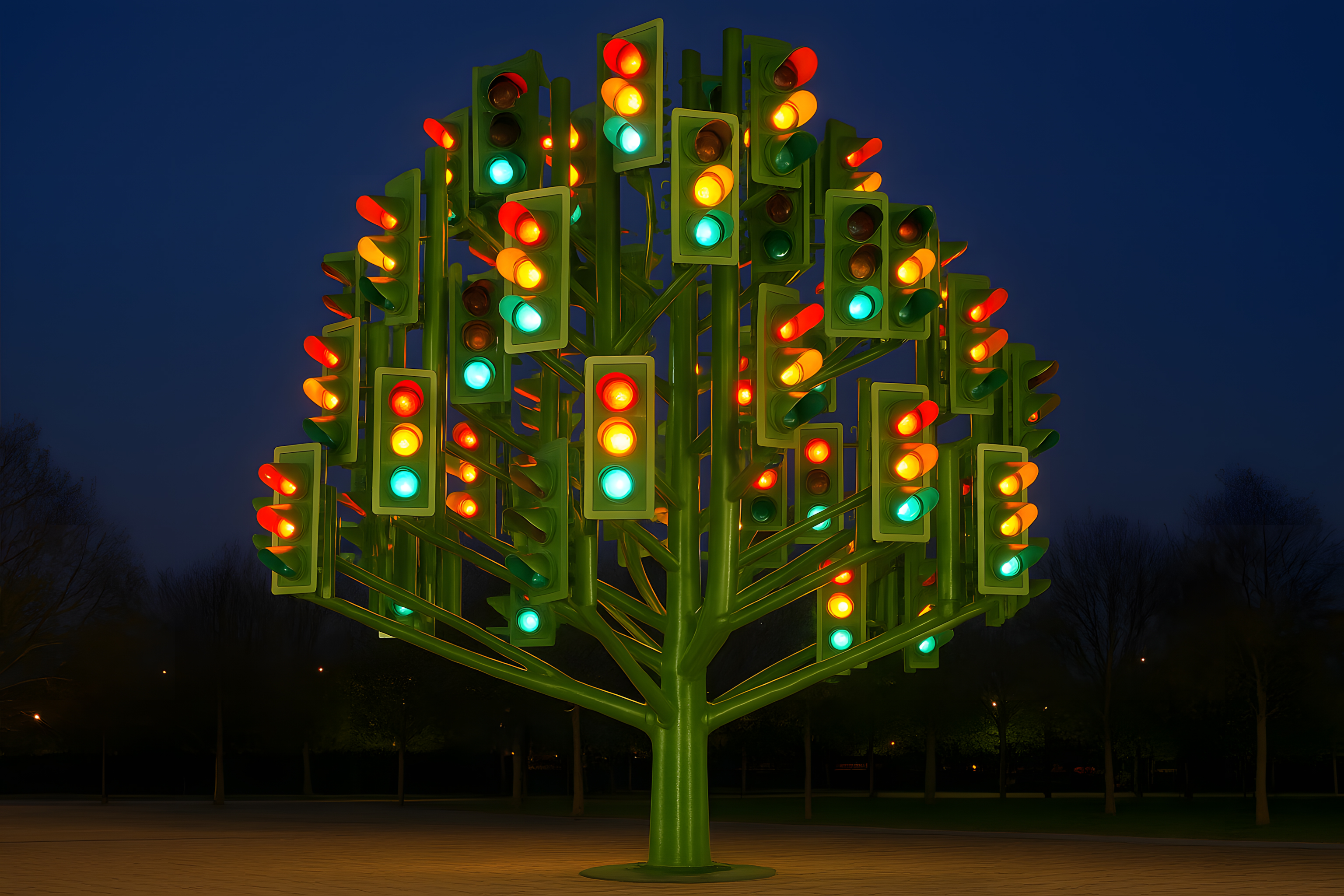 Diese faszinierende Nachtaufnahme zeigt einen illuminierten Lichterwald, der wie eine kunstvoll gestaltete Lichtskulptur erscheint. Der grüne Baum-ähnliche Korpus ist von bunten Verkehrsampeln übersät, die in einem stimmungsvollen Farbspiel aus Rot, Gelb und Grün erstrahlen. Dieses einzigartige Objekt im öffentlichen Raum bietet ein faszinierendes Bild der kreativen Stadtbeleuchtung. Das Foto eignet sich hervorragend für den Einsatz in Blogs, Newslettern oder Werbematerialien und ist als kostenloses Stockfoto in hoher Auflösung unter Creative Commons-Lizenz verfügbar.
