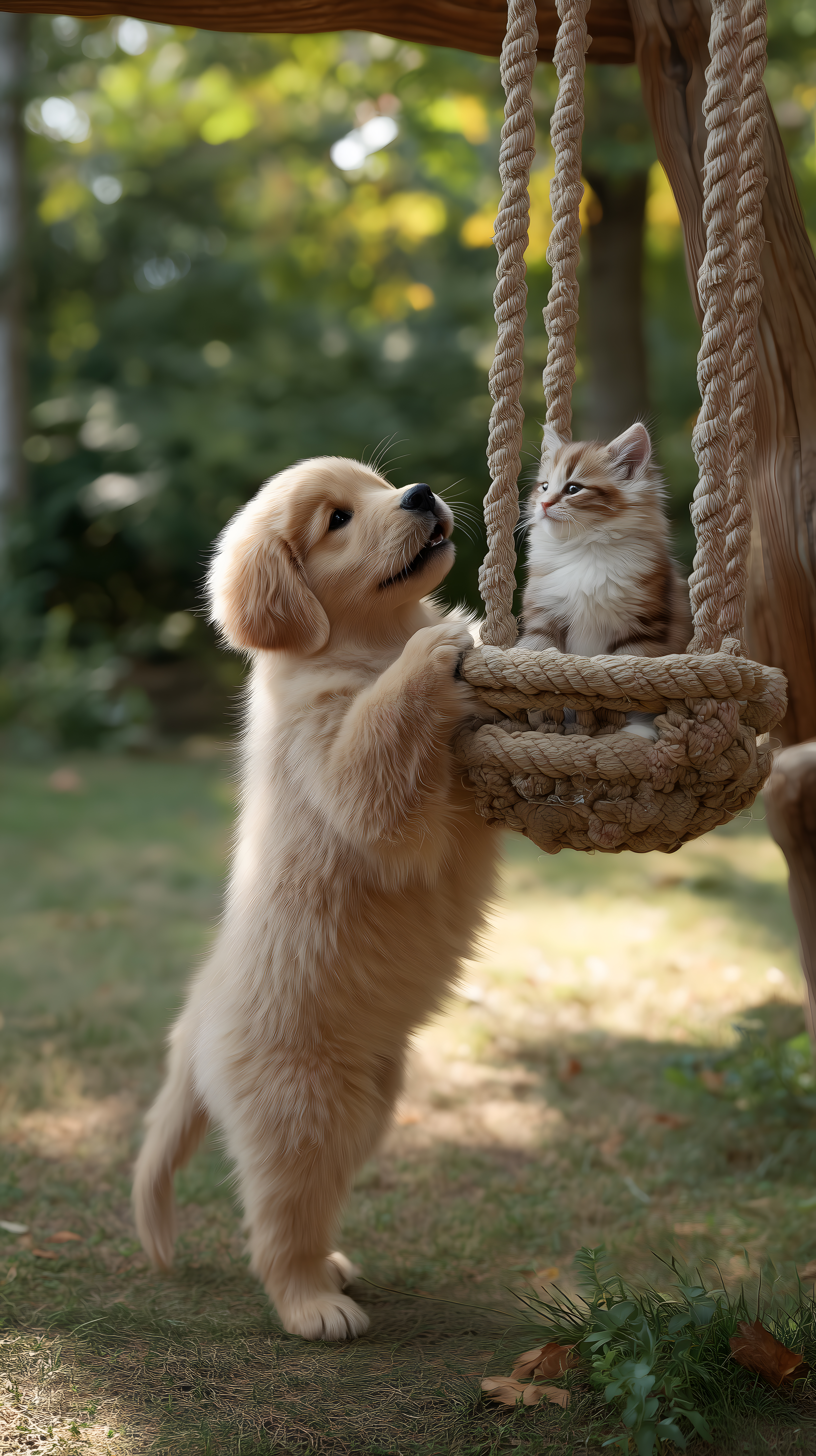 Das Foto zeigt einen niedlichen Welpen, der ein kleines Kätzchen in einer rustikalen Seilschaukel beobachtet. Die beiden Tiere scheinen miteinander zu spielen und zu interagieren, was eine süße und freundschaftliche Szene ergibt. Der Hintergrund ist von einer natürlichen, grünen Umgebung geprägt, was dem Bild einen friedlichen und entspannten Charakter verleiht. Dieses Foto eignet sich hervorragend als kostenloses Stockfoto für Blogs, Newsletter, Social Media-Beiträge oder Werbeanzeigen, bei denen ein niedliches, stimmungsvolles Tiermotiv gefragt ist. Es ist in hoher Auflösung und unter einer Creative Commons-Lizenz verfügbar.