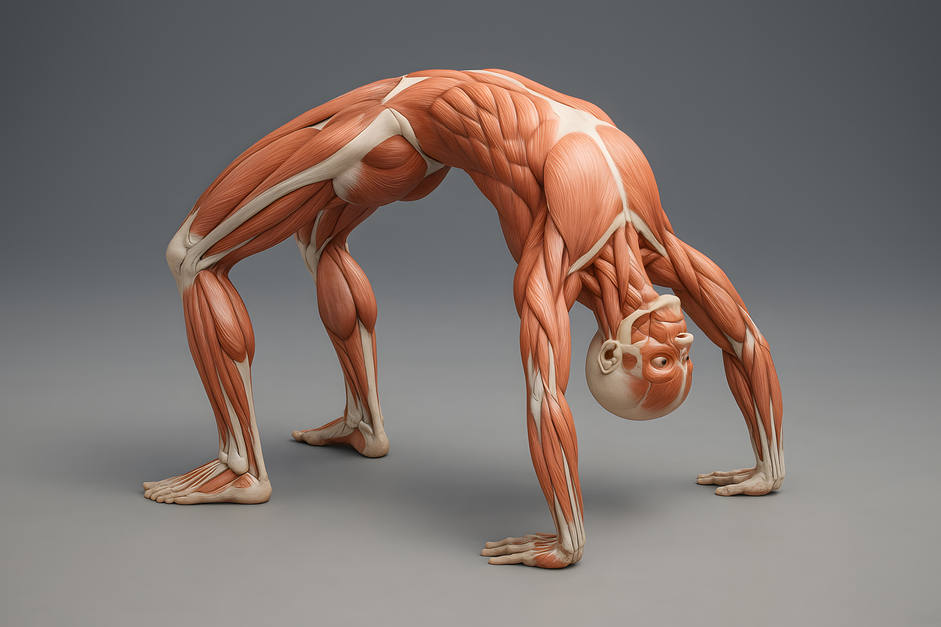 Diese detaillierte anatomische Darstellung zeigt eine Figur, die sich in einer tiefen Rückbeuge befindet. Die Muskeln und Sehnen des Körpers sind deutlich sichtbar, was einen faszinierenden Einblick in die komplexe Anatomie des menschlichen Körpers bietet. Das Bild hat einen klaren, klinischen Stil und eignet sich hervorragend für Anwendungen in den Bereichen Medizin, Gesundheit, Fitness und Sport. Als hochwertiges, kostenloses Stockfoto in hoher Auflösung und unter einer Creative-Commons-Lizenz kann es vielseitig eingesetzt werden - beispielsweise in Blogbeiträgen, Newslettern oder sozialen Medien, um Themen rund um Anatomie, Bewegung und Körperlichkeit anschaulich zu vermitteln.