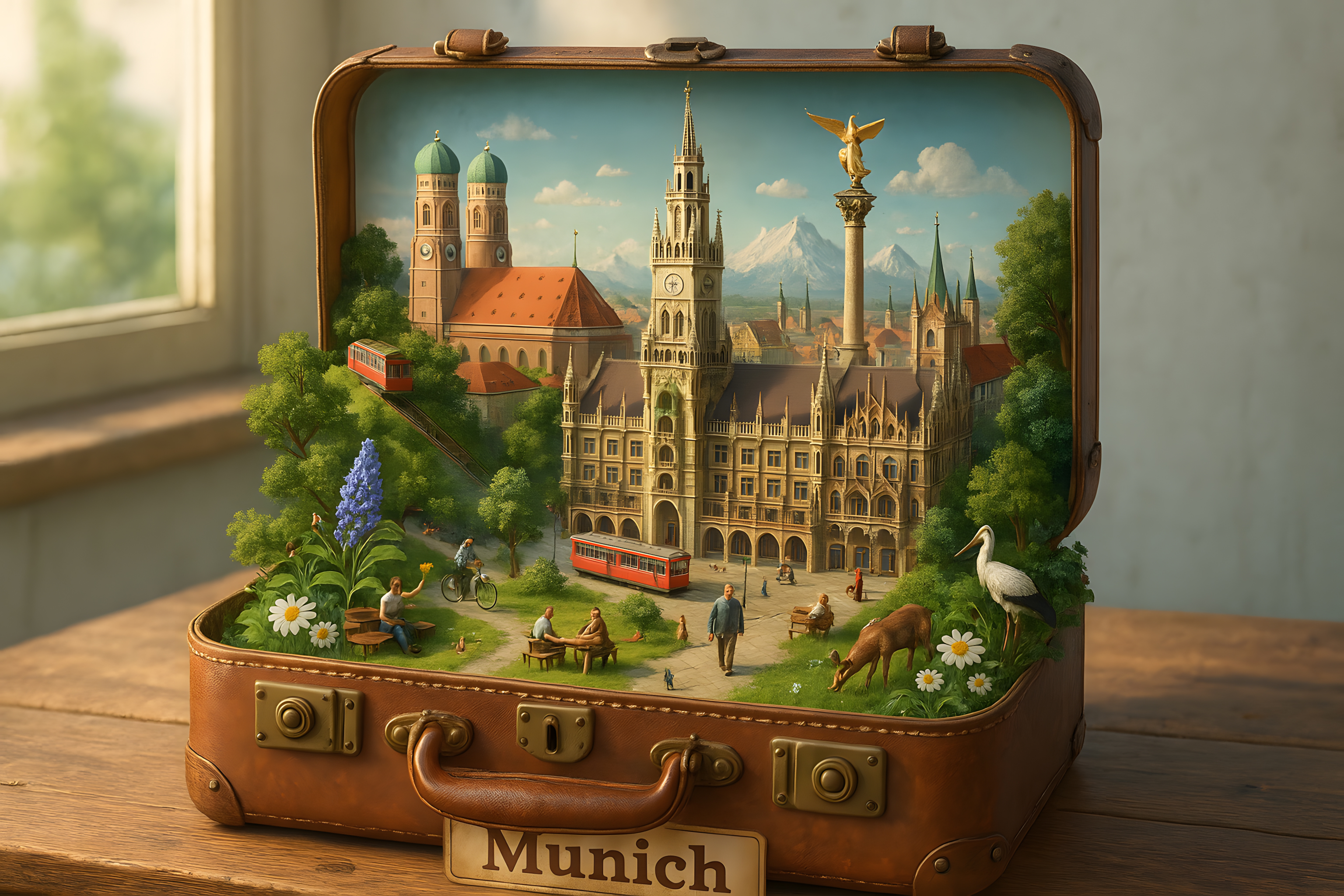 Dieses märchenhafte Bild zeigt eine detailreiche Miniaturszene der bayerischen Landeshauptstadt München in einem alten Koffer. Die historischen Gebäude wie die Frauenkirche, das Neue Rathaus und der Marienplatz sind liebevoll und realistisch dargestellt, umgeben von einer malerischen Parklandschaft mit Brunnen, Fahrradfahrern und Spaziergängern. Die warmen Farbtöne und das vintage Ambiente verleihen der Szene einen nostalgischen, gemütlichen Charme. Dieses hochauflösende Stockfoto eignet sich perfekt für die Verwendung in Blogs, Newslettern, Social-Media-Posts oder kreativen Werbematerialien zum Thema Reisen, Tourismus und Deutschland. Es steht unter einer kostenlosen Creative-Commons-Lizenz zur Verfügung.