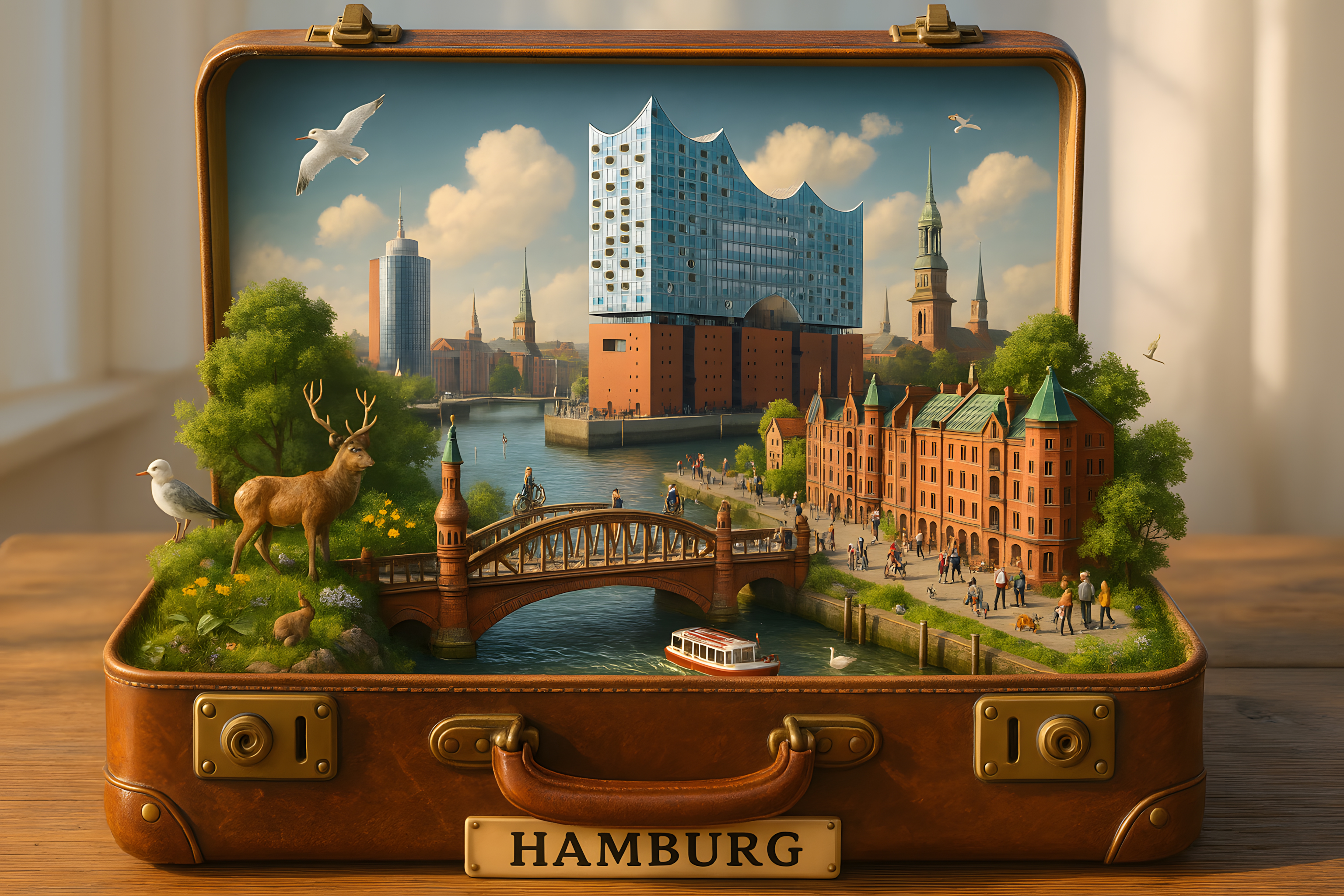 Dieses stimmungsvolle Foto zeigt eine detailreiche Ansicht der historischen Hamburger Speicherstadt und der modernen Elbphilharmonie, die in einem nostalgisch wirkenden Koffer präsentiert wird. Die Komposition vereint harmonisch historische und moderne Architektur, idyllische Natur mit Tieren sowie Alltagsleben an den Kanälen. Das Bild vermittelt eine romantische Vorstellung von Hamburg als Reiseziel und lässt sich hervorragend als kostenloses Stockfoto für Blog-Beiträge, Newsletter, Social-Media-Kanäle oder Werbematerialien in hoher Auflösung unter einer Creative-Commons-Lizenz nutzen.