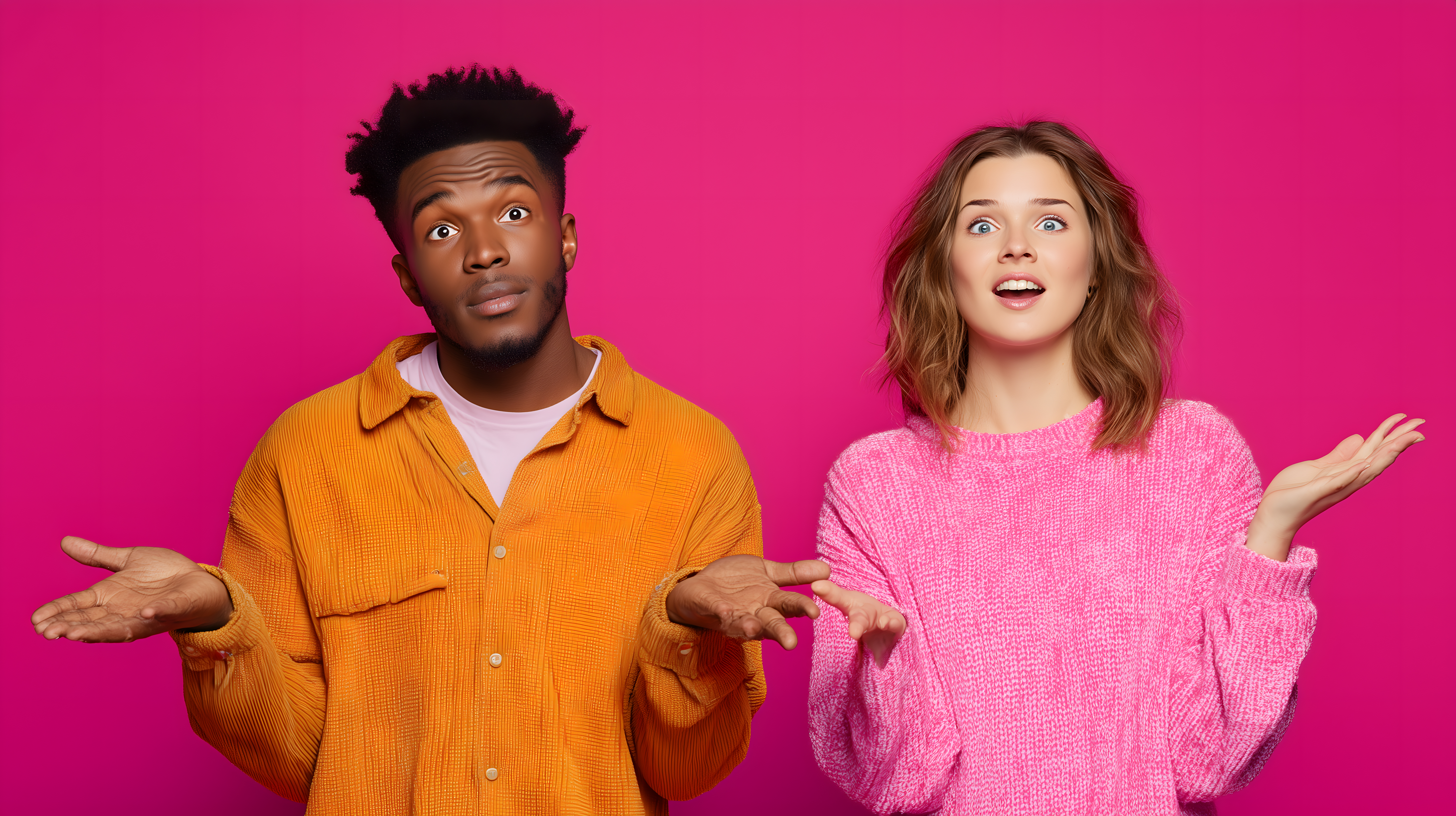 Das Bild zeigt ein junges, multiethnisches Paar mit fragendem Gesichtsausdruck vor einem leuchtend pinken Hintergrund. Der Mann trägt ein orangefarbenes Hemd, während die Frau einen pinkfarbenen, groben Pullover trägt. Beide schauen in die Kamera und scheinen von etwas überrascht zu sein. Die kontrastreichen Farben und die offene Körpersprache verleihen dem Bild eine lebendige, ungezwungene Atmosphäre. Dieses Stockfoto eignet sich hervorragend für den Einsatz in Blogbeiträgen, Newsletter-Designs, Social-Media-Posts oder Werbematerialien, die eine lebendige, jugendliche Ästhetik vermitteln möchten. Das Bild ist in hoher Auflösung und unter einer Creative-Commons-Lizenz verfügbar.