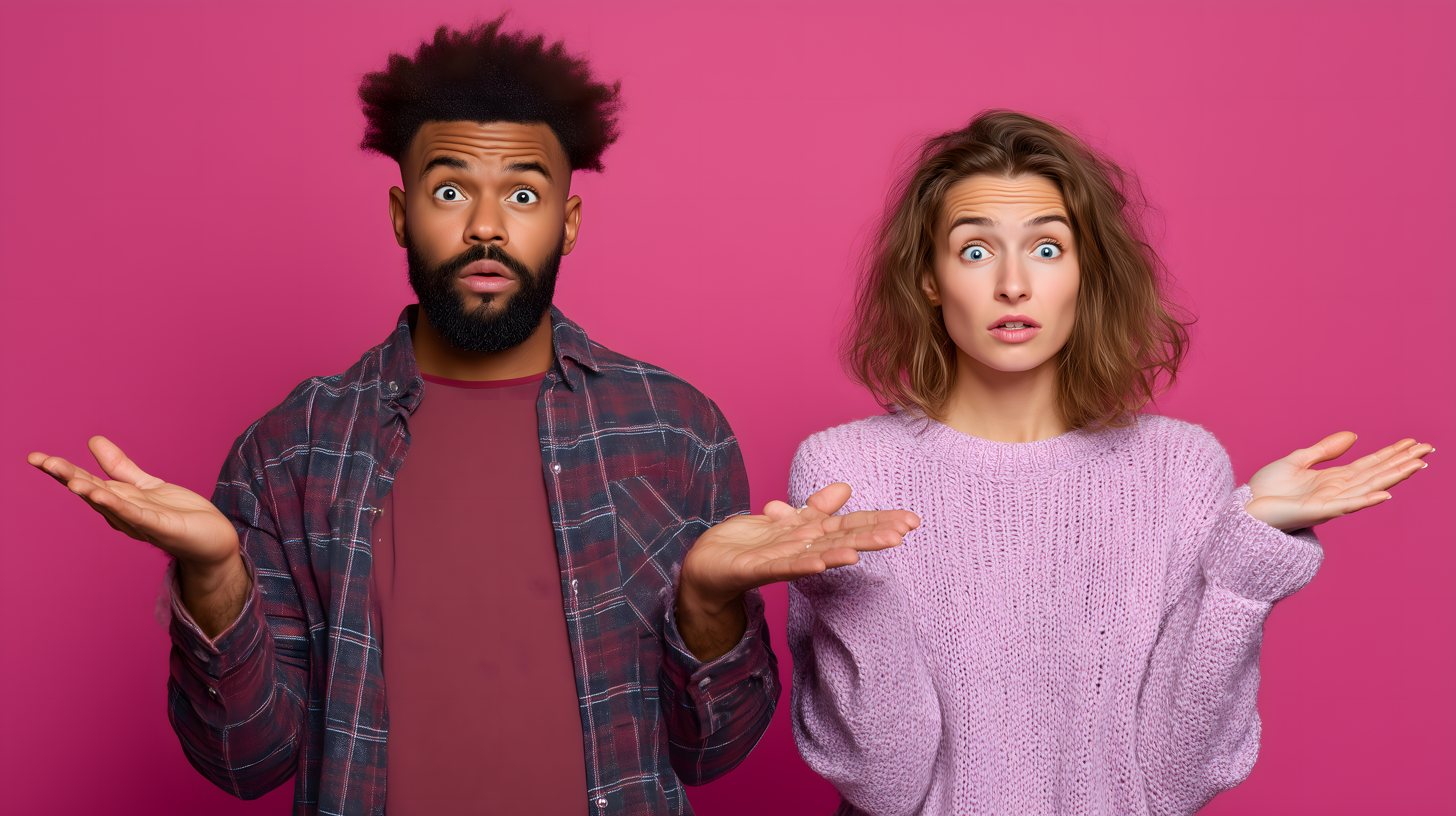 Das Bild zeigt zwei Personen, die überrascht und fragend die Arme heben. Der Mann hat dunkle, lockige Haare und einen Vollbart, die Frau hat lange, braune Haare. Beide blicken mit großen Augen in die Kamera und wirken verwirrt. Der Hintergrund ist durchgängig in einem intensiven Pink gehalten, wodurch die Aufmerksamkeit voll auf die Personen und ihre Gesten gelenkt wird. Das Foto eignet sich gut für den Einsatz in Blogs, Newslettern oder Social-Media-Posts, die Emotionen oder überraschende Situationen thematisieren. Als kostenloses Stockfoto in hoher Auflösung und unter einer Creative-Commons-Lizenz nutzbar.