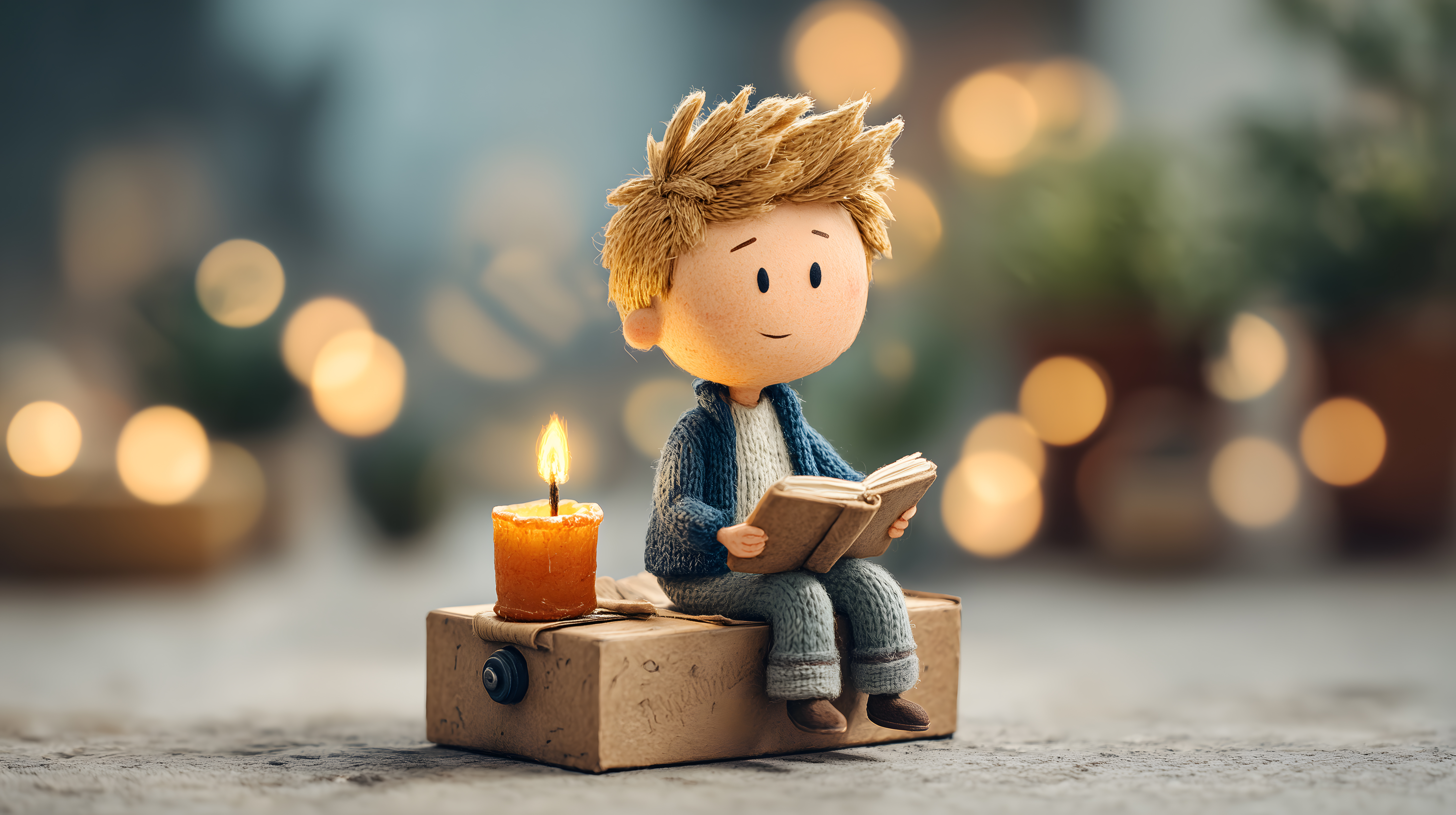 Das Foto zeigt einen niedlichen Cartoon-Jungen, der bei Kerzenlicht in einem Buch liest. Die Szene vermittelt eine gemütliche, winterliche Atmosphäre mit den unscharfen Lichterböckchen im Hintergrund. Der Junge sitzt auf einer Holzbox und wirkt vertieft in seine Lektüre, was eine Stimmung der Ruhe und Entspannung erzeugt. Das Bild eignet sich hervorragend als stimmungsvolles Motiv für Weihnachten, Winter oder allgemein als Illustration für eine ruhige, fantasievolle Szene. Als kostenloses Stockfoto in hoher Auflösung und unter Creative-Commons-Lizenz kann es vielfältig in Blogs, Newslettern, Social-Media-Beiträgen oder Werbematerialien eingesetzt werden.