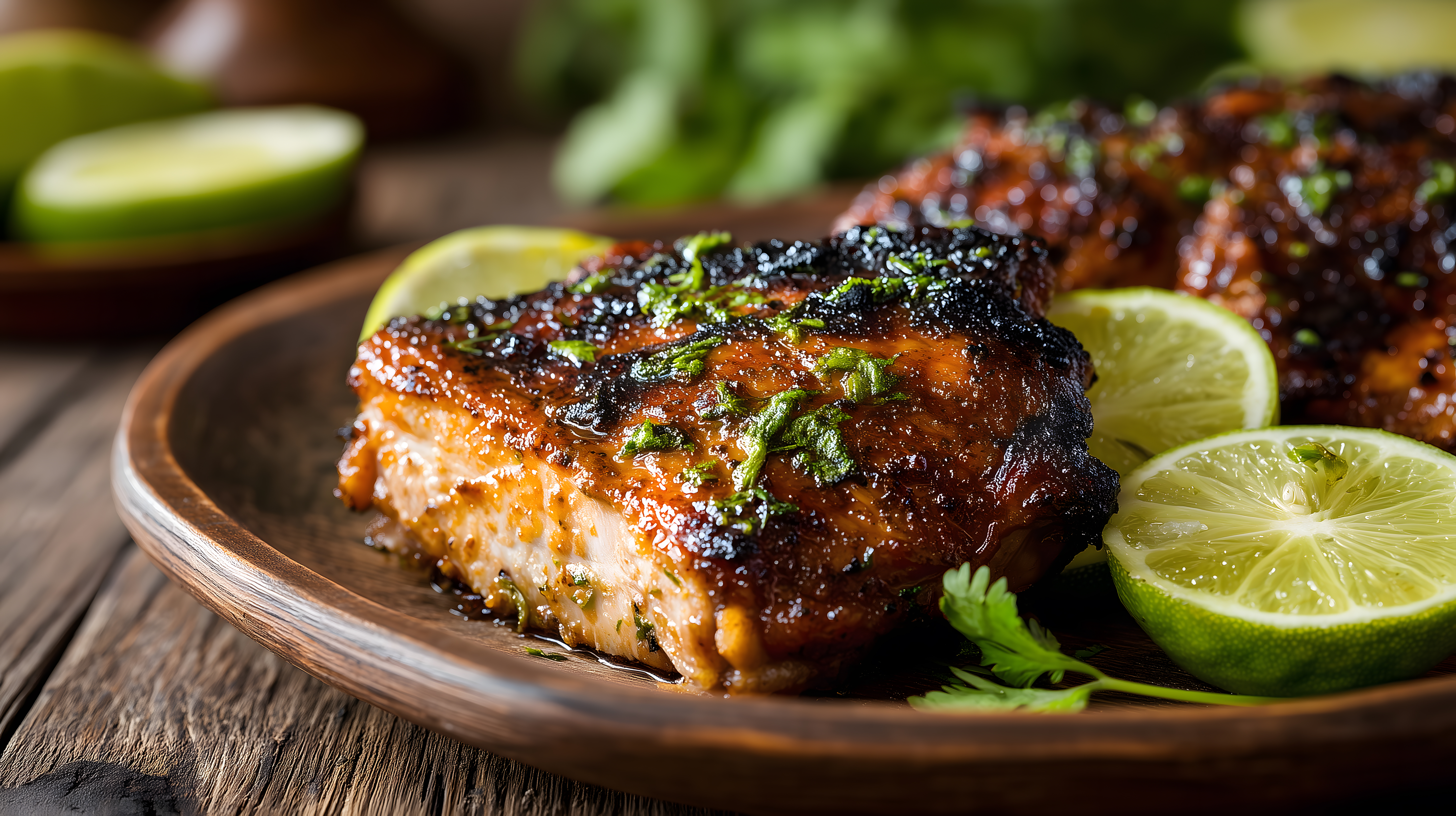 Das Foto zeigt ein appetitliches glasiertes Hähnchenstück, serviert auf einem rustikalen Holzteller. Das Fleisch ist von einer glänzenden, karamellisierten Sauce bedeckt und wird von frisch geschnittenen Zitronenscheiben und Petersilienblättern umrahmt. Die Nahaufnahme betont die saftigen Details und verleiht dem Gericht eine verlockende Ausstrahlung. Dieses Stockfoto eignet sich hervorragend für die Verwendung in Foodblogs, Rezeptsammlungen, Restaurantwebsites oder Werbematerialien rund um das Thema Kochen und Genuss. Es ist in hoher Auflösung und unter einer Creative-Commons-Lizenz verfügbar.