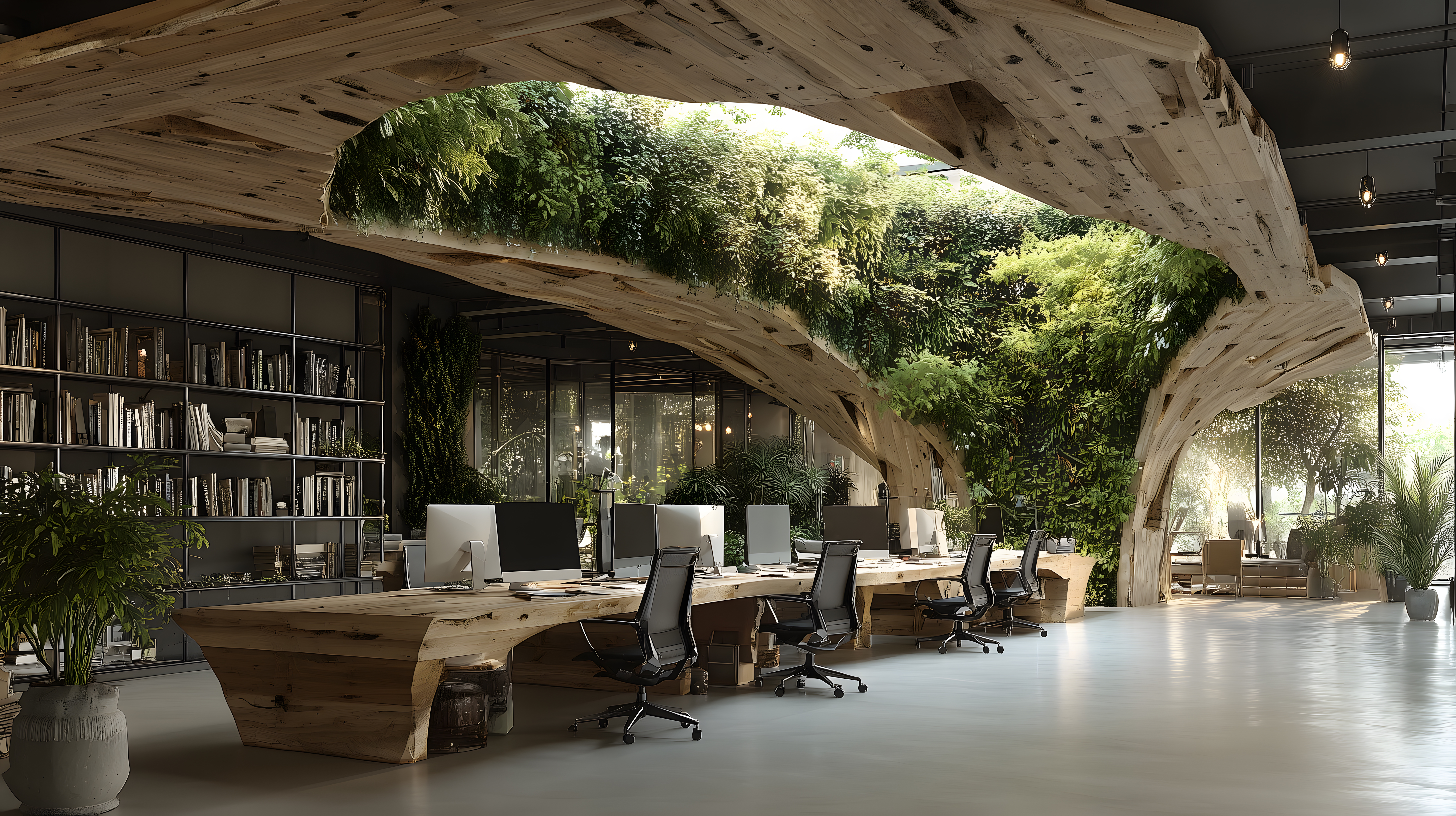 Dieses Foto zeigt ein beeindruckendes Bürodesign mit einer natürlichen, ganzheitlichen Ästhetik. Der Raum ist geprägt von hohen Holzwölbungen, die eine warme und einladende Atmosphäre schaffen. Üppiges Grün in Form von Pflanzen und Begrünung integriert sich nahtlos in die Architektur und verleiht dem Büro einen organischen, biophilen Charakter. Große Fenster lassen viel Tageslicht in den Raum und verbinden die Innengestaltung harmonisch mit der umliegenden Natur. Die Arbeitsplätze sind modern und funktional, mit Computerarbeitsplätzen und zeitgemäßen Möbeln ausgestattet. Insgesamt vermittelt dieses Bild den Eindruck eines einzigartigen, inspirierenden Arbeitsumfelds, das Nachhaltigkeit und Kreativität in perfekter Balance vereint. Als hochwertiges Stockfoto in hoher Auflösung kann es für verschiedenste Zwecke wie Blogs, Websites, soziale Medien oder Werbekampagnen genutzt werden - selbstverständlich unter Creative-Commons-Lizenz kostenfrei verfügbar.