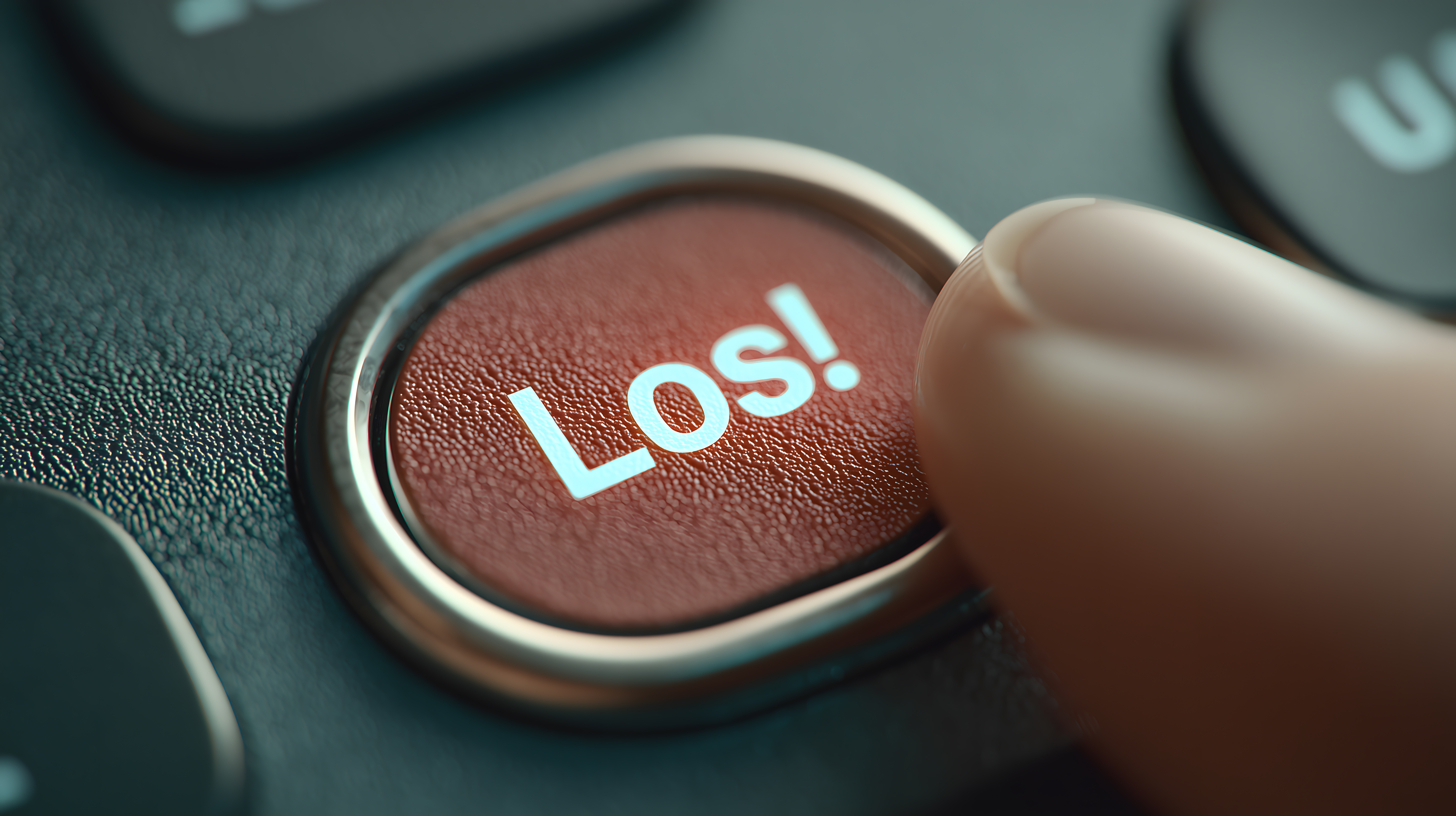 Das Bild zeigt einen roten Druckknopf mit der weißen Aufschrift 'Los!'. Der Knopf ist auf einer dunklen, ledrigen Oberfläche platziert, was ihm ein modernes und hochwertiges Aussehen verleiht. Das Design des Knopfes ist minimalistisch und fokussiert die Aufmerksamkeit auf den Hauptfokus - den Texteffekt 'Los!'. Dieses Stockfoto eignet sich hervorragend für den Einsatz in Werbematerialien, Blogbeiträgen, Newsletter-Designs oder Social-Media-Posts, die ein frisches und einladendes Erscheinungsbild anstreben. Das Foto ist in hoher Auflösung und unter der Creative-Commons-Lizenz frei verwendbar.