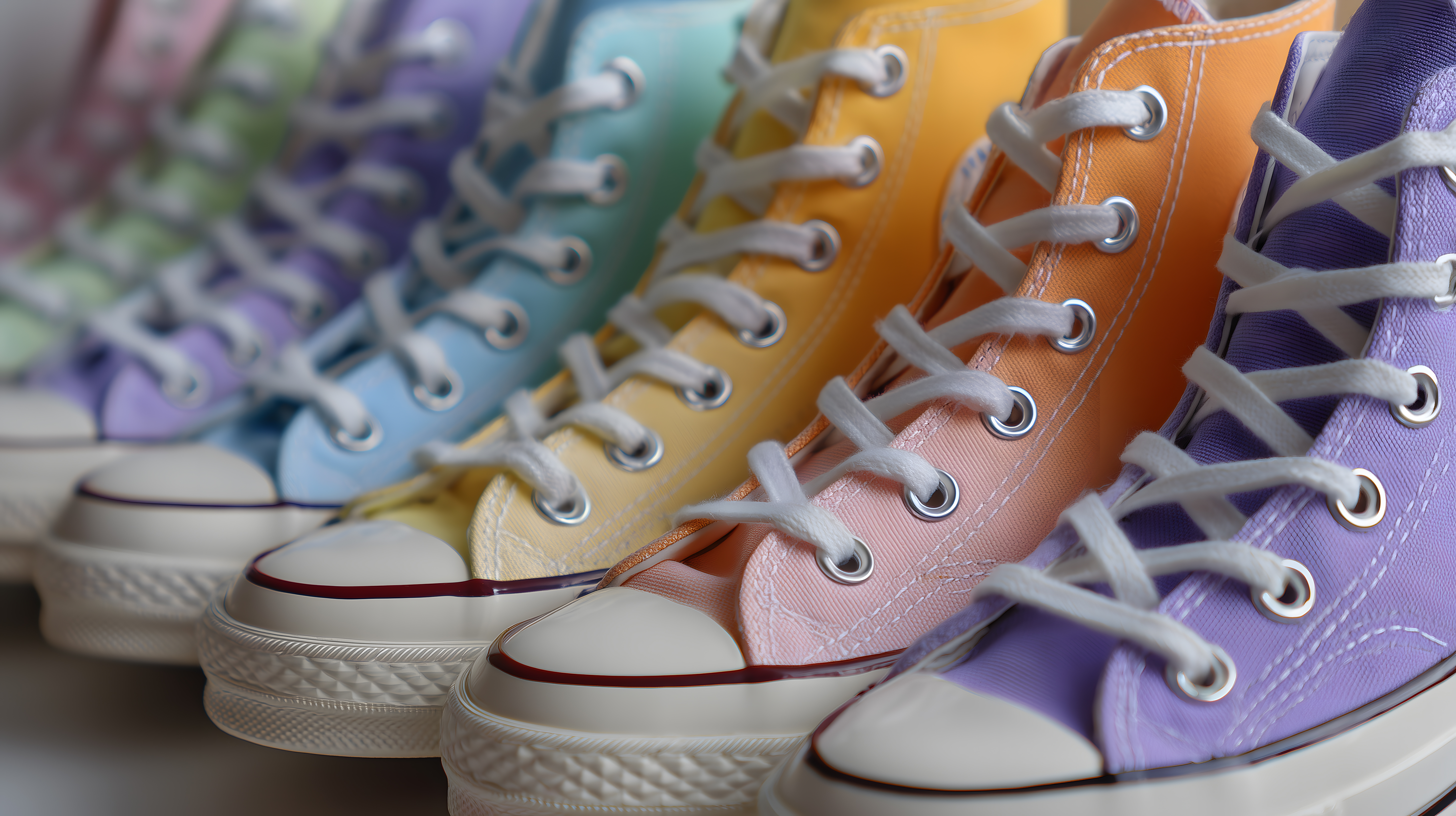 Das Bild zeigt eine Reihe bunter Turnschuhe in Regenboogenfarben, die vor einem hellen Hintergrund angeordnet sind. Die Schuhe haben einen lässigen, jugendlichen Stil und verleihen dem Foto eine fröhliche, farbenfroheStilichadhe. Dieses Stockfoto eignet sich hervorragend für verschiedene Einsatzzwecke wie Blogbeiträge, Newsletter-Gestaltung, Social-Media-Posts oder Werbematerialien, die ein modernes, jugendliches Flair vermitteln möchten. Das Foto ist in hoher Auflösung verfügbar und steht unter einer Creative-Commons-Lizenz zur Verfügung.