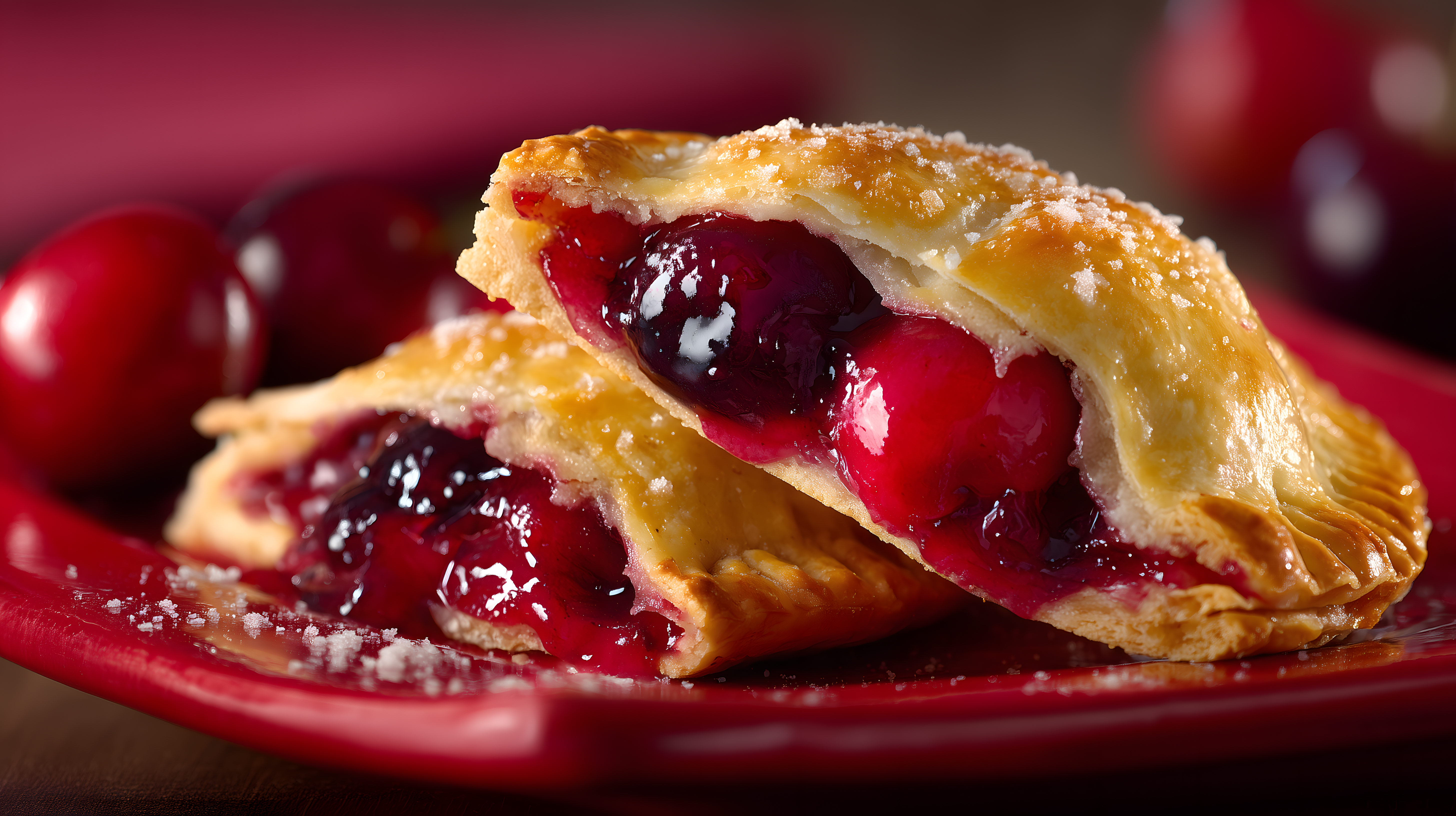 Das Bild zeigt eine angeschnittene, frisch gebackene Kirschpastete auf einem roten Teller. Die Kruste ist goldbraun und leicht gezuckert, während das Innere eine saftige, rote Kirschfüllung offenbart. Die Pastete strahlt eine einladende und appetitliche Optik aus und wirkt wie ein köstliches Dessert oder Snack. Das Foto eignet sich hervorragend für die Verwendung in Rezeptbüchern, Kochblogs, Werbeanzeigen für Backwaren oder andere kulinarische Kontexte. Als kostenloses Stockfoto in hoher Auflösung und unter einer Creative-Commons-Lizenz kann es frei genutzt werden.