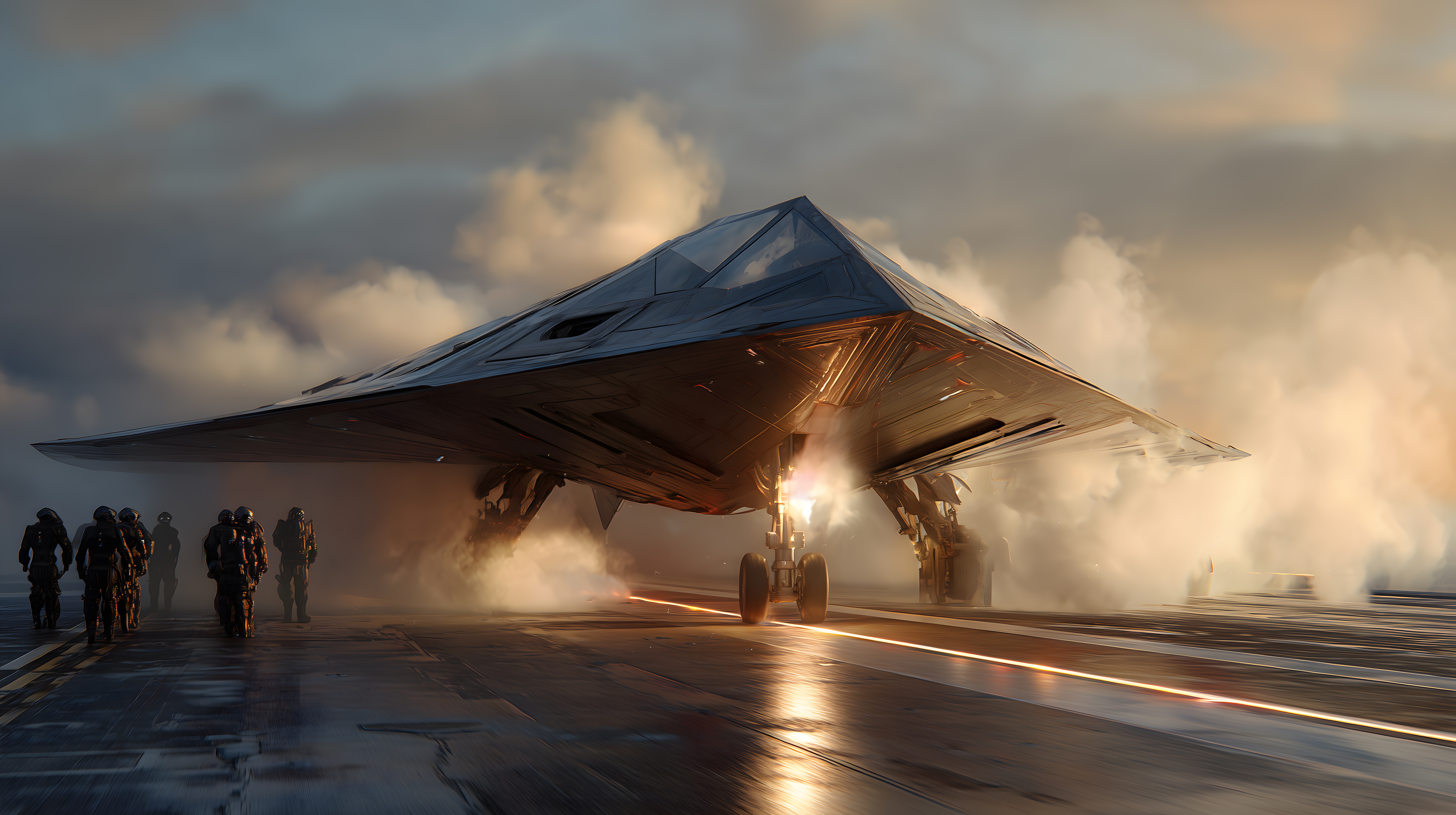 Das Bild zeigt einen futuristischen, dunklen Kampfjet, der dramatisch und mit viel Rauch und Nebel von einem Flugzeugträger startet. Die Szenerie wirkt düster und beklemmend, mit einem orangeroten Himmelshintergrund, der auf einen nahenden Sonnenuntergang hindeutet. Eine Gruppe Soldaten beobachtet den Startvorgang. Das Foto erzeugt eine Atmosphäre von Spannung und Gefahr, die typisch für militärische Einsätze ist. Es eignet sich gut als kostenloses Stockfoto für Blogs, Newsletter oder Social-Media-Beiträge zu Themen wie Militär, Technik oder Kriegsführung in hoher Qualität und unter Creative-Commons-Lizenz.