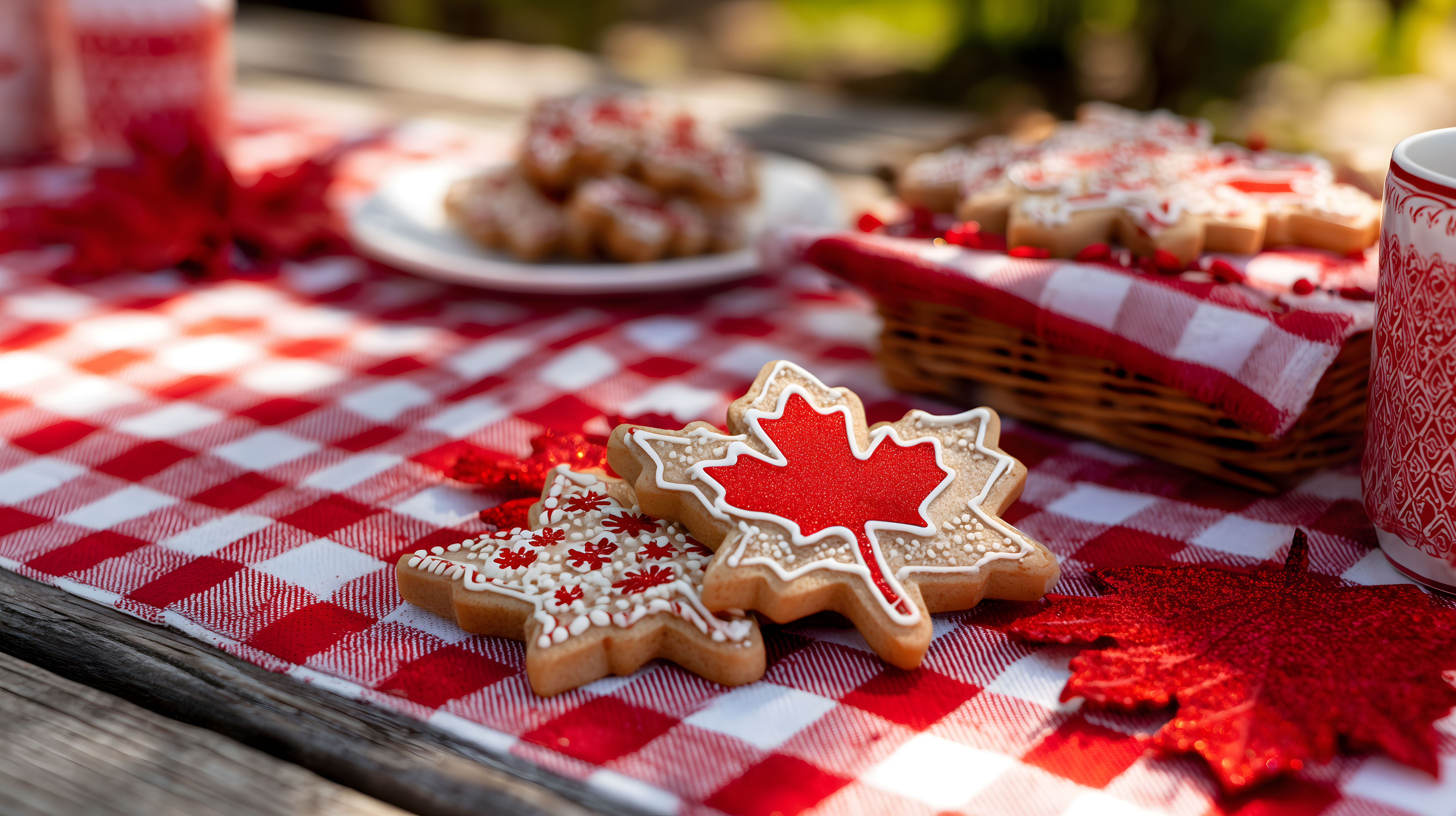 Dieses charmante Foto zeigt eine Auswahl kanadischer Backwaren auf einem karierten Picknick-Tuch. Der Fokus liegt auf einem mit Ahornblatt-Motiv verzierten Lebkuchen, der von anderen Keksen und Plätzchen in rot-weißen Farben umgeben ist. Der rustikale Holztisch, die Servietten und das typisch kanadische Ahornblatt-Design verleihen dem Bild einen gemütlichen, traditionellen Charakter. Diese Aufnahme eignet sich hervorragend als Hintergrund für kanadisch inspirierte Designs, Rezepte oder Reiseberichte, sowohl in gedruckter Form als auch für digitale Anwendungen wie Blogs, Newsletter oder Social-Media-Beiträge. Als kostenloses Stockfoto in hoher Auflösung und unter einer Creative-Commons-Lizenz kann es vielfältig verwendet werden.