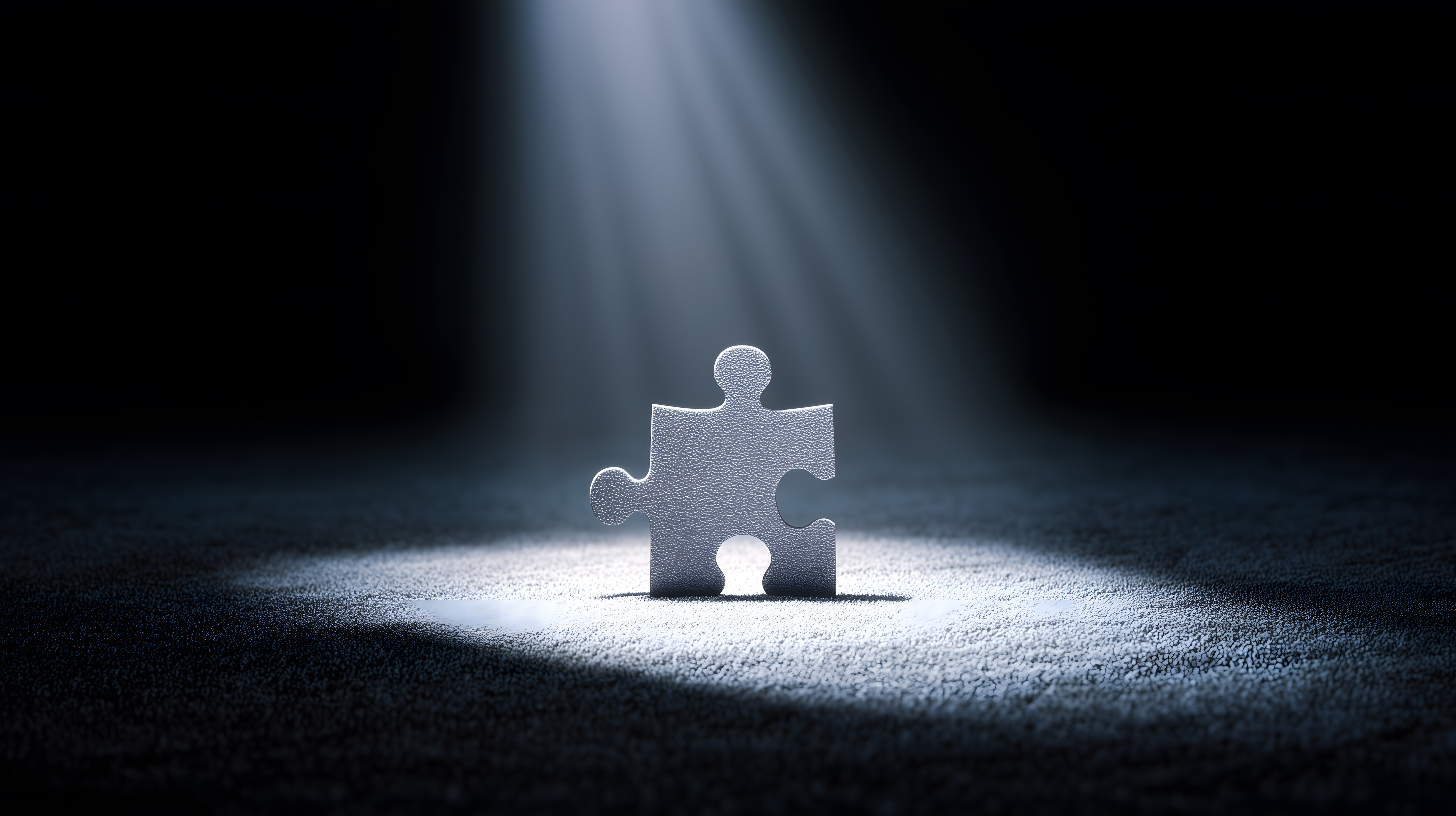 Das Bild zeigt ein einzelnes, weißes Puzzleteil, das von einem Scheinwerfer beleuchtet wird und vor einem dunklen Hintergrund steht. Das Puzzleteil hebt sich durch den hellen Lichteinfall deutlich vom Untergrund ab und erscheint dadurch besonders hervorgehoben und bedeutsam. Die reduzierte Farbgebung in Grautönen verleiht dem Bild eine minimalistisch-konzeptionelle Ästhetik.