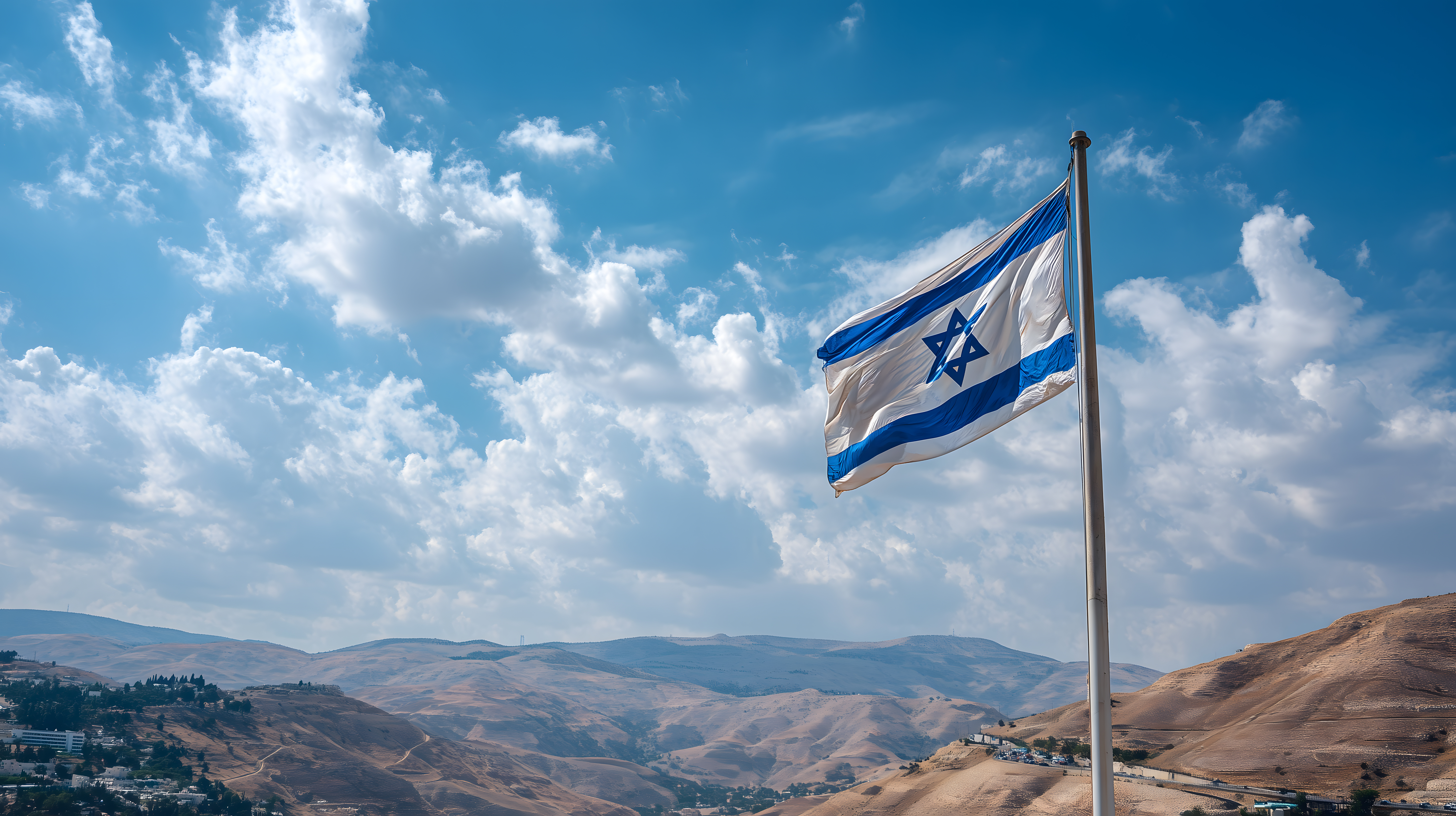 Dieses Bild zeigt eine panoramische Aussicht über eine hügelige, bergige Landschaft in Israel. Im Vordergrund weht stolz die israelische Flagge mit dem Davidstern vor einem tiefblauen Himmel, der von Wolken durchzogen ist. Die atemberaubende Szenerie vermittelt eine Atmosphäre von Nationalstolz, Weite und Erhabenheit. Das Foto eignet sich hervorragend als kostenloses Stockfoto für Blogs, Newsletter, Social-Media-Beiträge oder Werbekampagnen mit Bezug zu Israel, Reisen, Landschaften oder patriotischen Themen. Die hochauflösende Datei unter einer Creative-Commons-Lizenz kann für diverse Projekte genutzt werden.