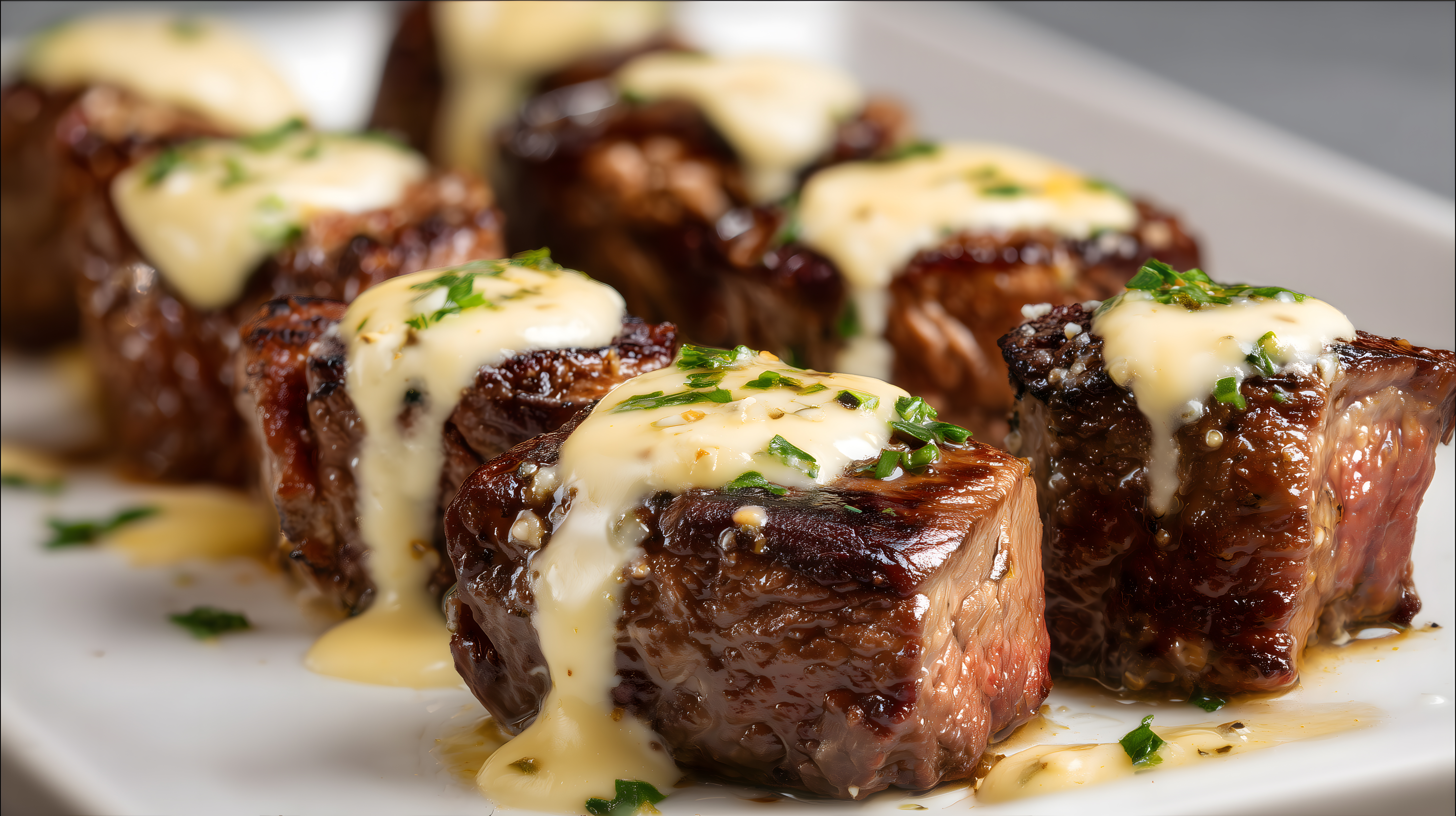Das Bild zeigt saftige Steakstücke, die auf einem Teller angerichtet sind. Die Steaks sind mit einer leckeren Kräuterbutter aus Knoblauch und frischen Kräutern bedeckt, die eine köstliche Sauce bildet. Die Stücke haben eine schöne Bräunung und sehen sehr appetitlich aus. Die Anordnung auf dem Teller ist sorgfältig und elegant, was das Gericht zusätzlich aufwertet. Dieses hochwertige Stockfoto eignet sich ideal für die Verwendung in Blogs, Newslettern, Social-Media-Beiträgen oder Werbematerialien rund um das Thema Kulinarik und Gastronomie. Das Bild ist in hoher Auflösung und unter einer Creative-Commons-Lizenz frei nutzbar.