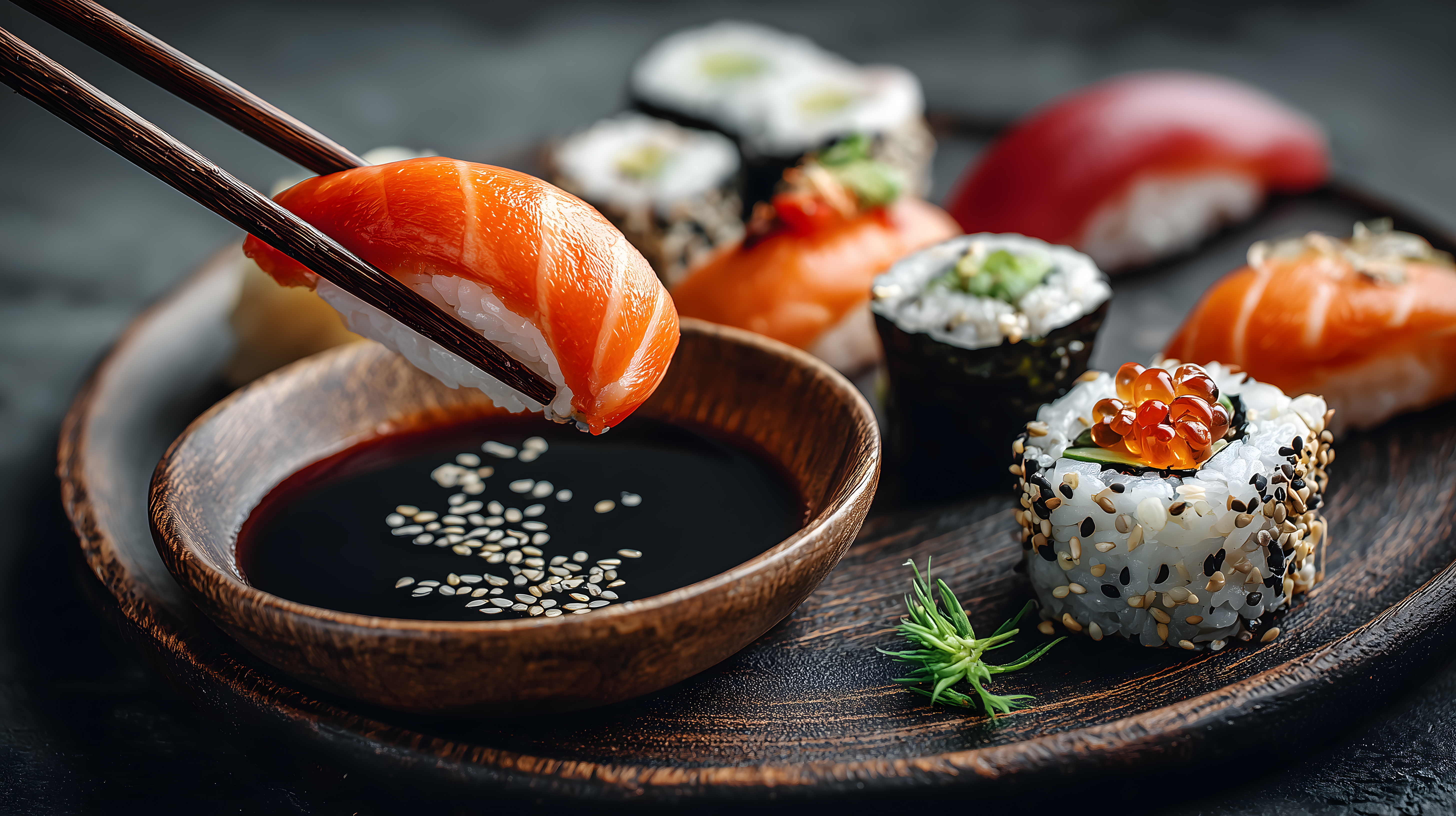 Dieses Bild zeigt eine Anordnung von schmackhaftem japanischem Sushi auf einem rustikalen Holzbrett. Im Vordergrund ist eine Schale mit dunkler Sojasauce zu sehen, die perfekt zum Dippen der Sushi-Stücke geeignet ist. Die Sushi-Häppchen sind mit Lachs, Thunfisch, Kaviar und anderen Zutaten dekorativ angerichtet und verleihen dem Bild einen authentischen, appetitanregenden Charakter. Die Kombination aus den frischen Farben, der hochwertigen Präsentation und dem traditionellen Zubehör wie Stäbchen macht dieses Bild zu einem hervorragenden Motiv für Blogs, Social-Media-Kanäle oder Werbekampagnen rund um japanische Küche, Gastronomie und kulinarischen Genuss. Als kostenloses Stockfoto in hoher Auflösung und unter Creative-Commons-Lizenz ist es vielseitig einsetzbar.