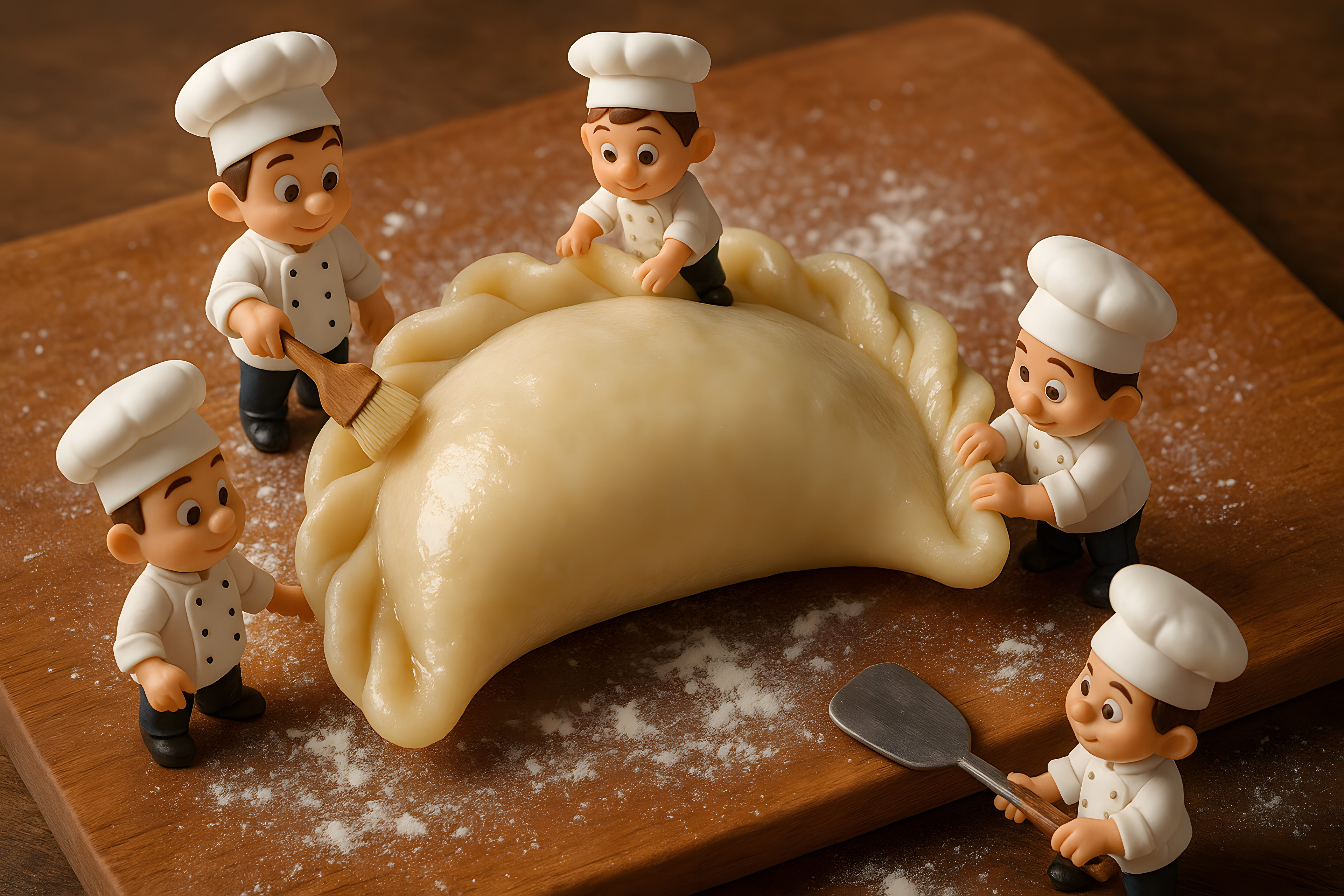 Das Bild zeigt eine Szene mit putzigen Puppenköchen, die gemeinsam einen großen Teigling auf einem Holzbrett formen. Die Köche tragen weiße Uniformen und Kochmützen und scheinen eifrig bei der Arbeit zu sein. Im Hintergrund ist etwas Mehl verstreut, was die Bäckerei-Atmosphäre unterstreicht. Das Foto eignet sich hervorragend als Stockfoto für Beiträge rund um Backen, Kochen, Lebensmittel und Kulinarik. Es ist in hoher Auflösung und unter einer Creative-Commons-Lizenz verfügbar.