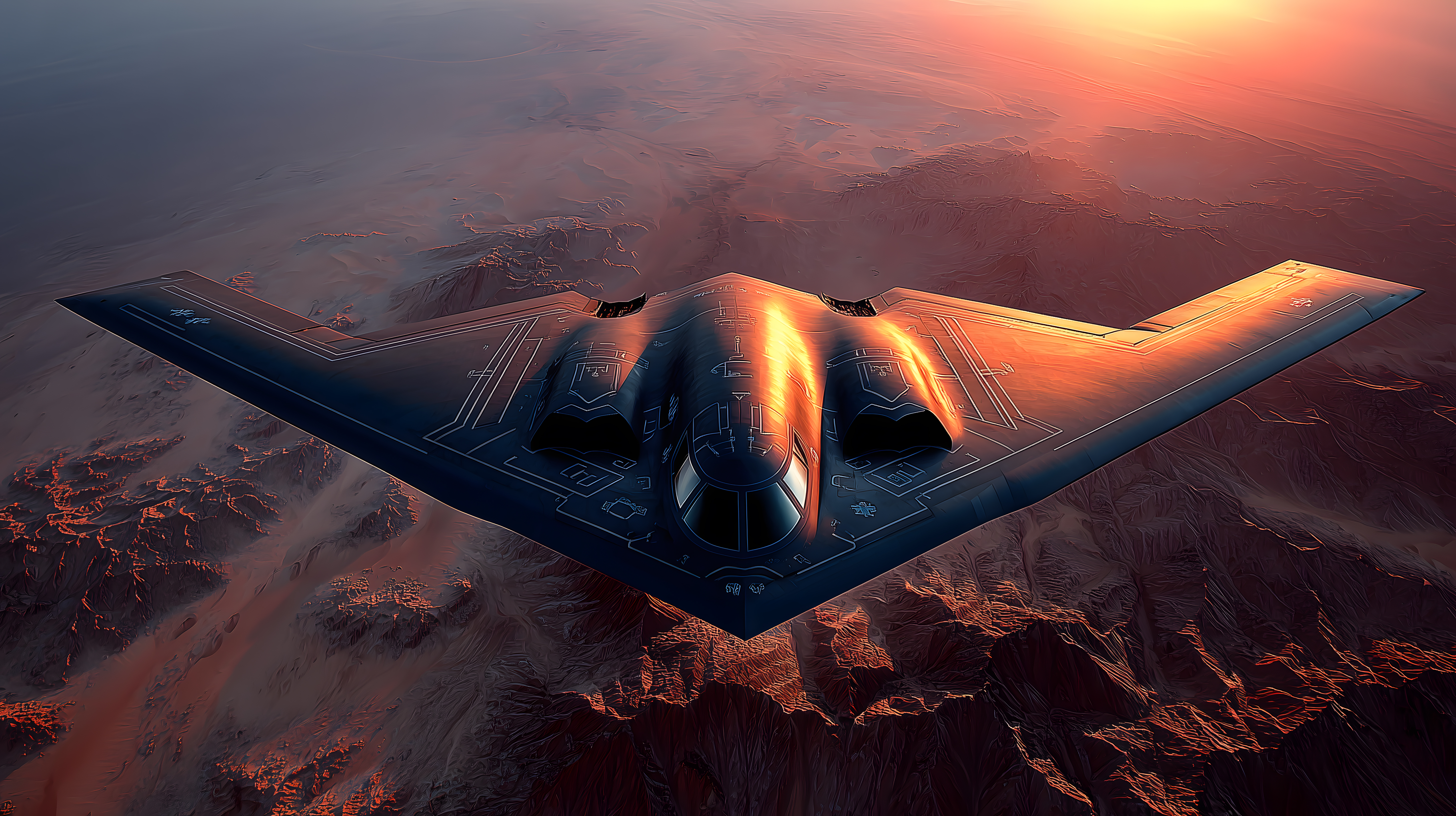 Das Bild zeigt einen amerikanischen B2-Tarnkappenbomber, der in einer dramatischen Abendstimmung über einer Wüstenlandschaft fliegt. Die Silhouette des hochmodernen Kampfjets hebt sich eindrucksvoll vom orangeroten Himmel ab, der von einem prächtigen Sonnenuntergang illuminiert wird. Der Kontrast zwischen der dunklen, aerodynamischen Form des Flugzeugs und der feuerroten Farbkulisse erzeugt eine Atmosphäre von Spannung und Action. Dieses Foto eignet sich hervorragend für den Einsatz in Blogbeiträgen, Social-Media-Kanälen oder als Illustration in Werbematerialien zum Thema Militärtechnik, Flugsimulation oder Action-Videospiele. Als kostenloses Stockfoto in hoher Auflösung und unter Creative-Commons-Lizenz lässt es sich vielseitig nutzen.