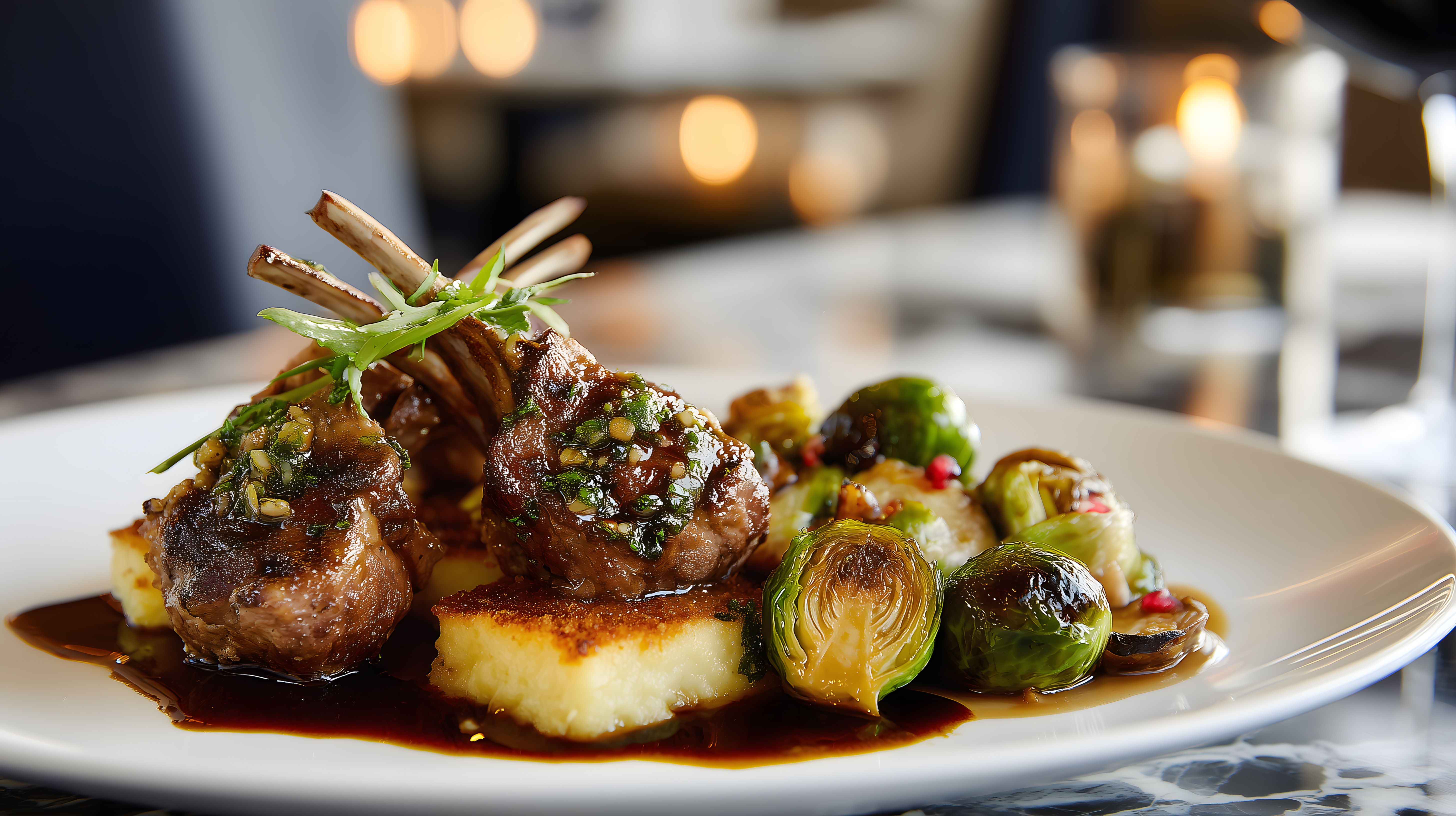 Das Foto zeigt ein aufwendig angerichtetes Lammgericht auf einem weißen Teller. Im Mittelpunkt befindet sich ein Lammsteak, das liebevoll mit einer dunklen, saucenartigen Glasur und grünen Kräutern garniert ist. Auf der Seite sind Rosenkohl-Hälften und eine Portion Kartoffelpüree als Beilage angerichtet. Der Teller selbst ist aus Porzellan und passt gut zum rustikalen, aber eleganten Erscheinungsbild des Gerichts.
