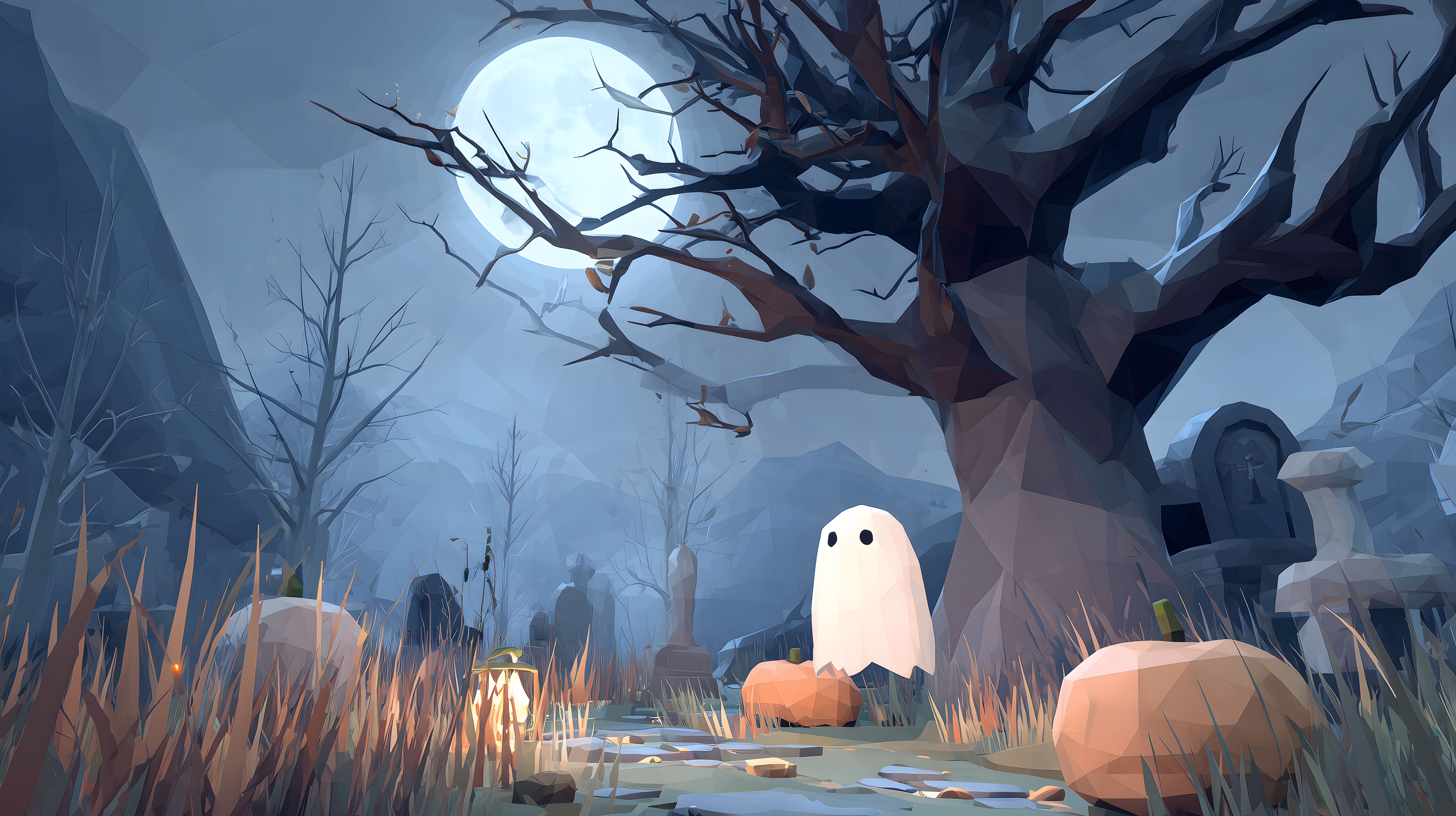 Dieses Foto zeigt eine atmosphärische Halloween-Szene in einem reduzierten, niedrigpolygonalen Grafikstil. Im Vordergrund ist eine weiße, geisterhafte Figur zu sehen, die auf einem Stein in einer düsteren, nebligen Landschaft sitzt. Im Hintergrund erstreckt sich ein mystischer Friedhof mit verwitterten Grabsteinen und einem verzweigten, kahlen Baum, der sich vor einem gespenstischen Vollmond abhebt. Die Farbpalette ist überwiegend in Grau- und Blautönen gehalten, was der Szene eine unheimliche, rätselhafte Stimmung verleiht. Dieses hochauflösende, lizenzfreie Stockfoto eignet sich hervorragend für Halloween-Projekte, Blogbeiträge, Social-Media-Inhalte oder andere Anwendungen mit gruseligem Charakter.