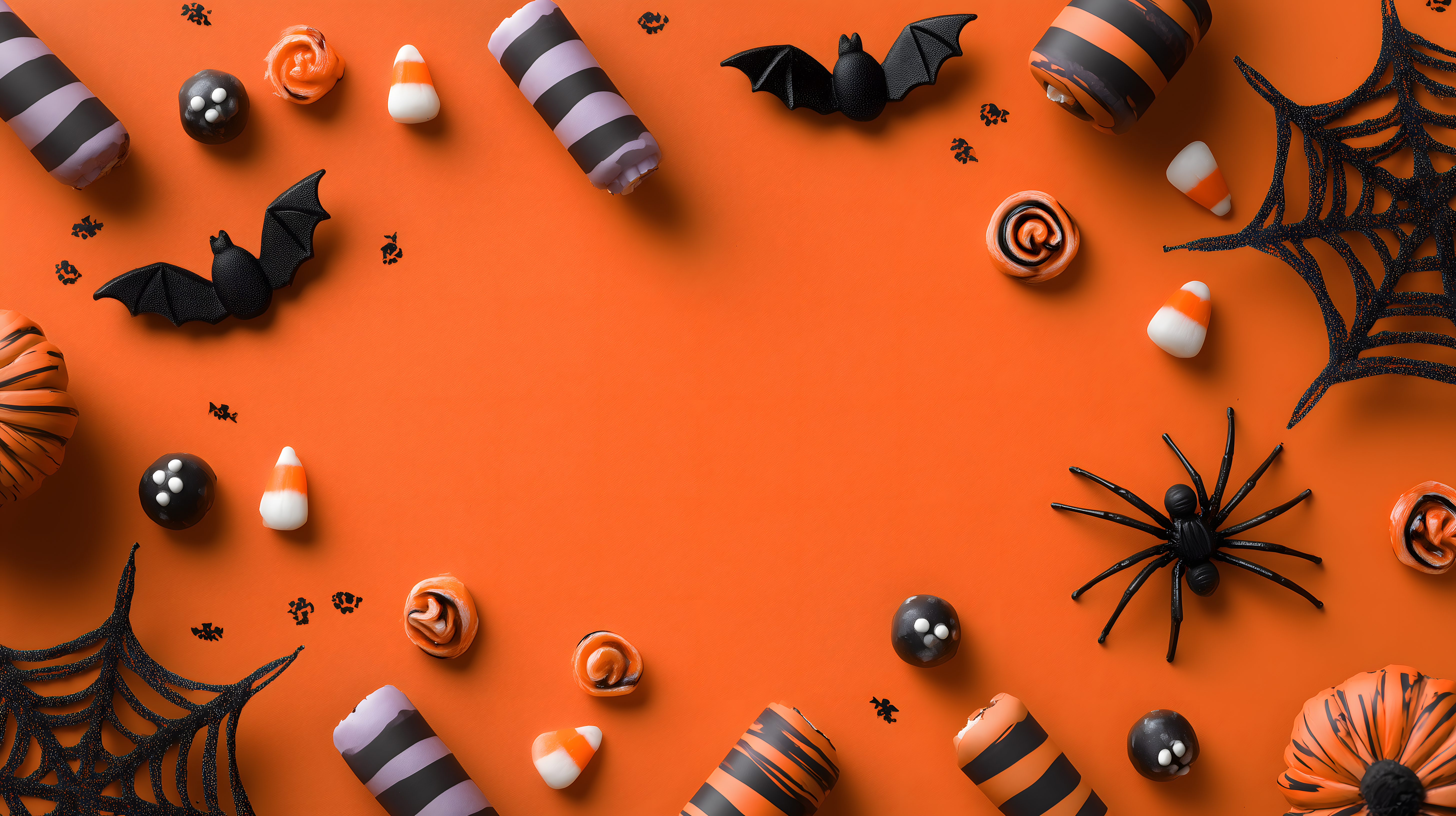 Dieses Foto zeigt eine bunte Ansammlung von Halloween-Dekorationsartikeln, die auf einem leuchtend orangefarbenen Hintergrund flach angeordnet sind. Im Zentrum befinden sich ein Kürbis und ein Spinnennetz, umgeben von schwarzen Fledermäusen, Süßigkeiten, Luftschlangen und weiteren Accessoires in den Farben Orange, Schwarz und Weiß. Die stimmungsvolle Draufsicht-Komposition mit dem starken Farbkontrast schafft einen kreativen Hintergrund, der sich ideal für Halloween-Werbekampagnen, Social-Media-Posts oder Grußkarten eignet. Dieses hochauflösende Stockfoto ist unter einer Creative-Commons-Lizenz frei verwendbar.